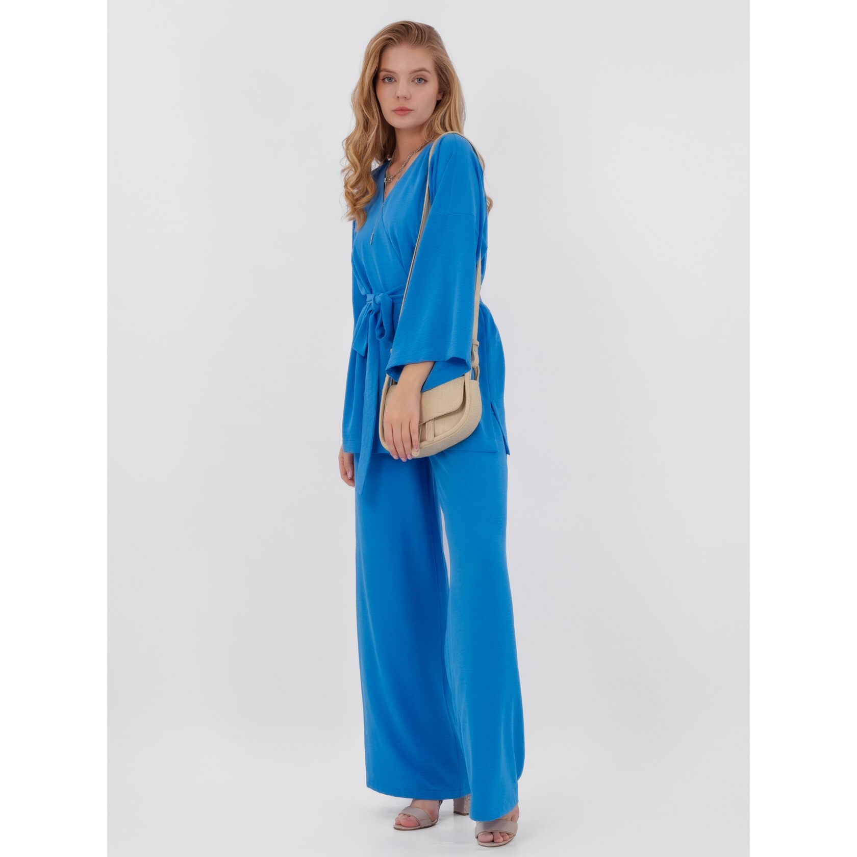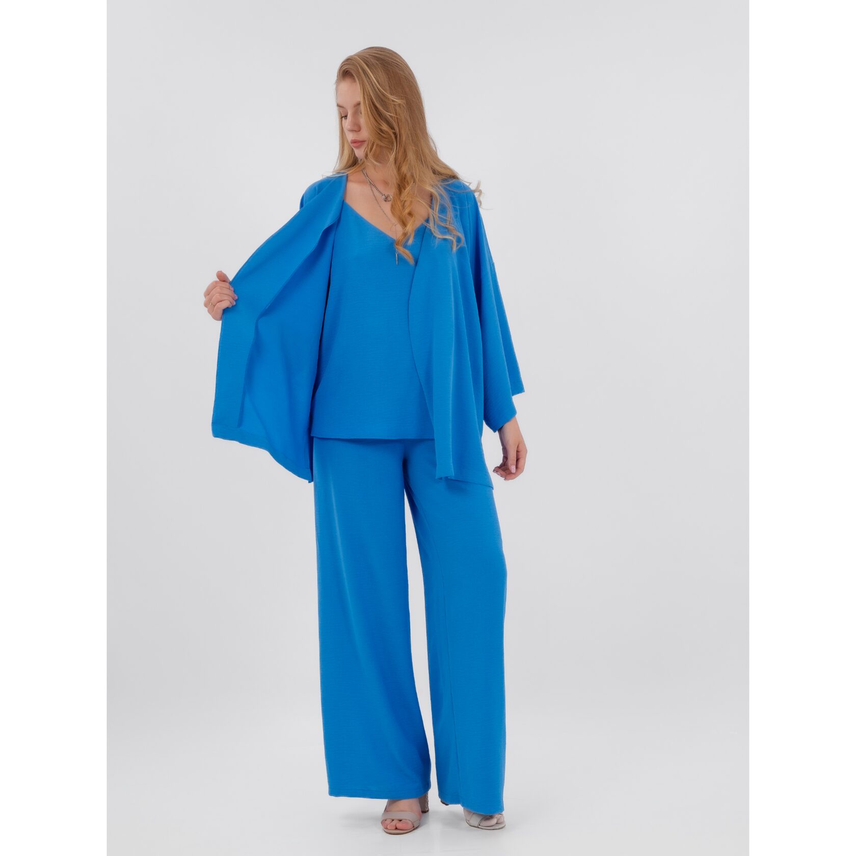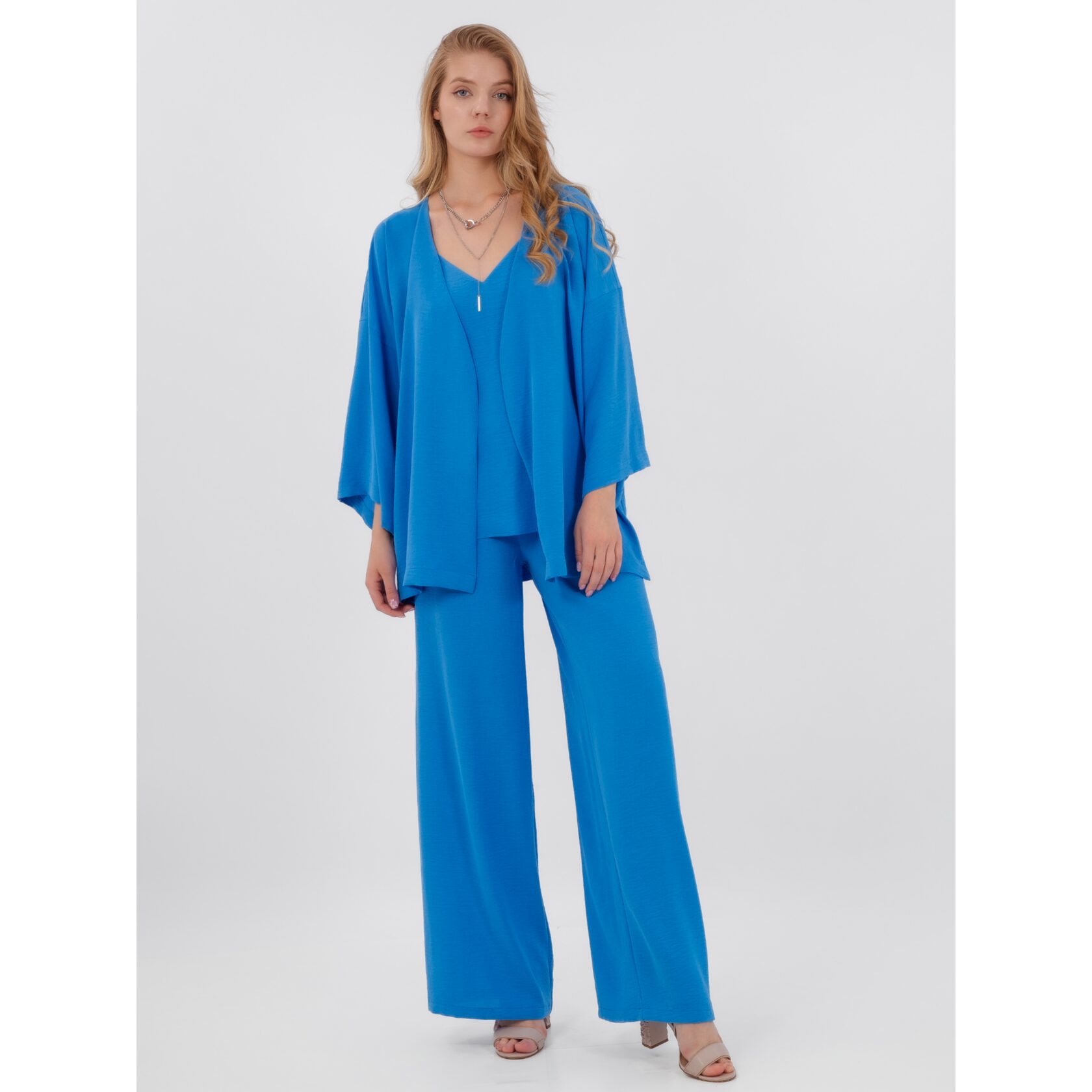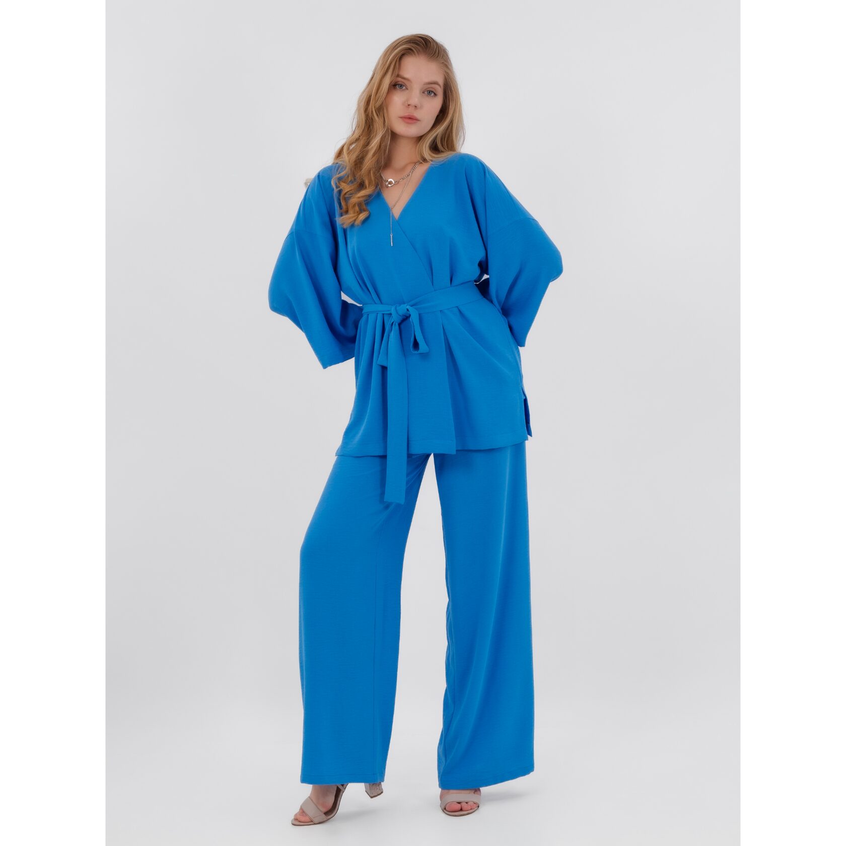 Костюм женский состоит из пяти предметов: топ на регулируемых лямках, брюки-палаццо, короткое кимоно, пояс и резинка для волос в подарочной упаковке. очень качественный пошив. Материал: сей. Сделано в России.