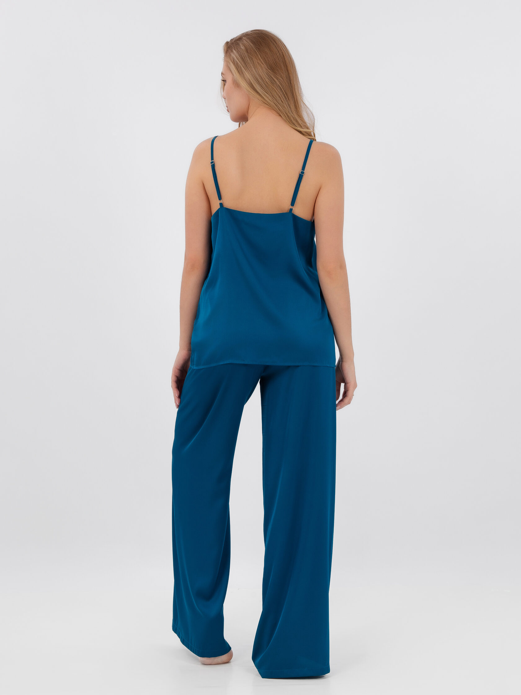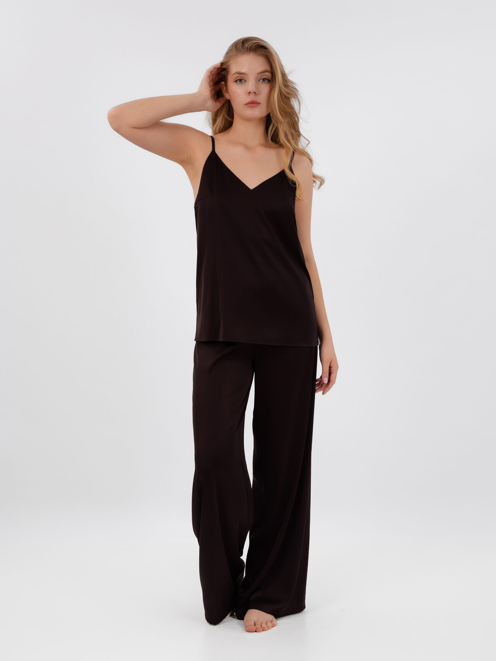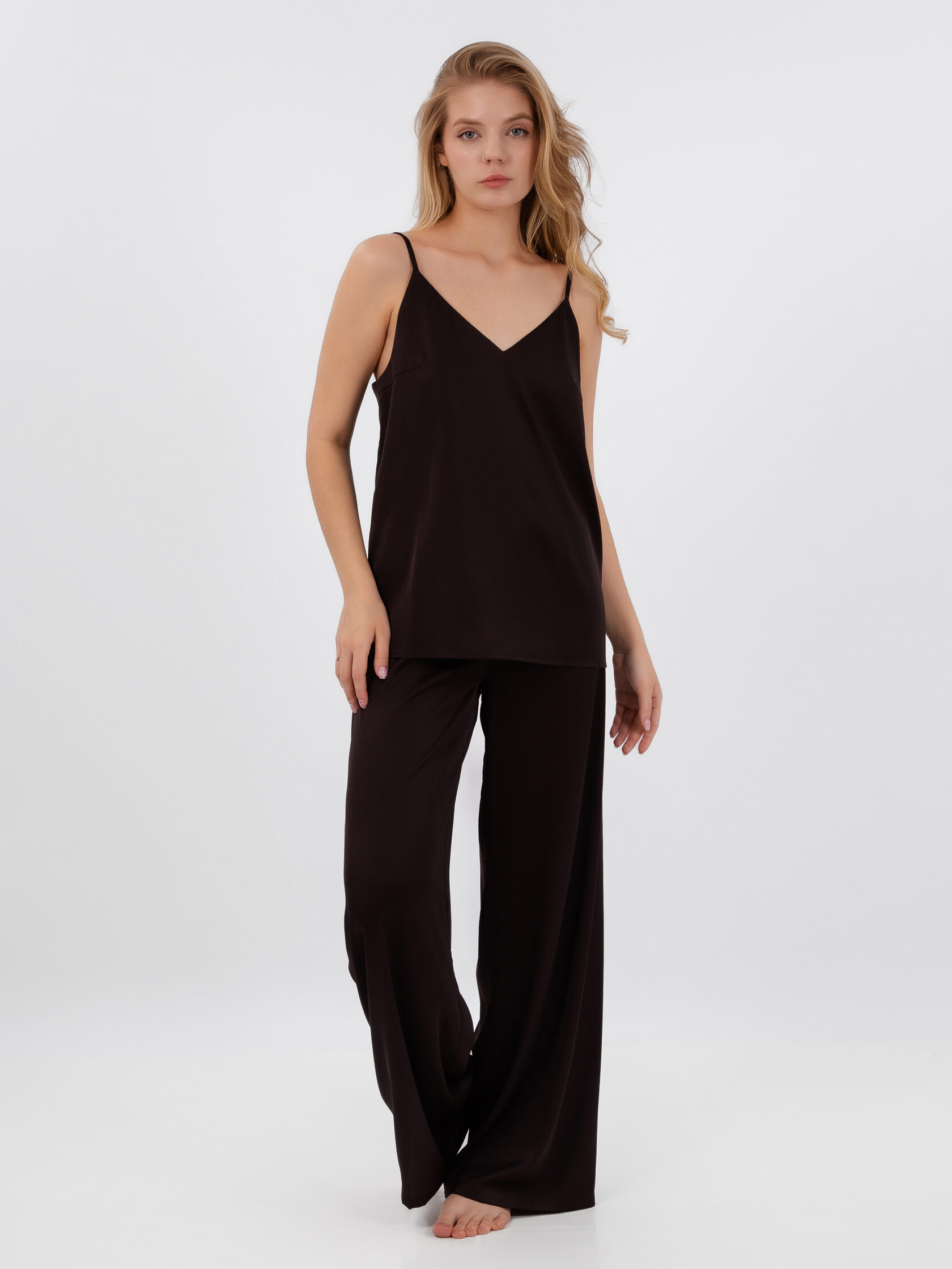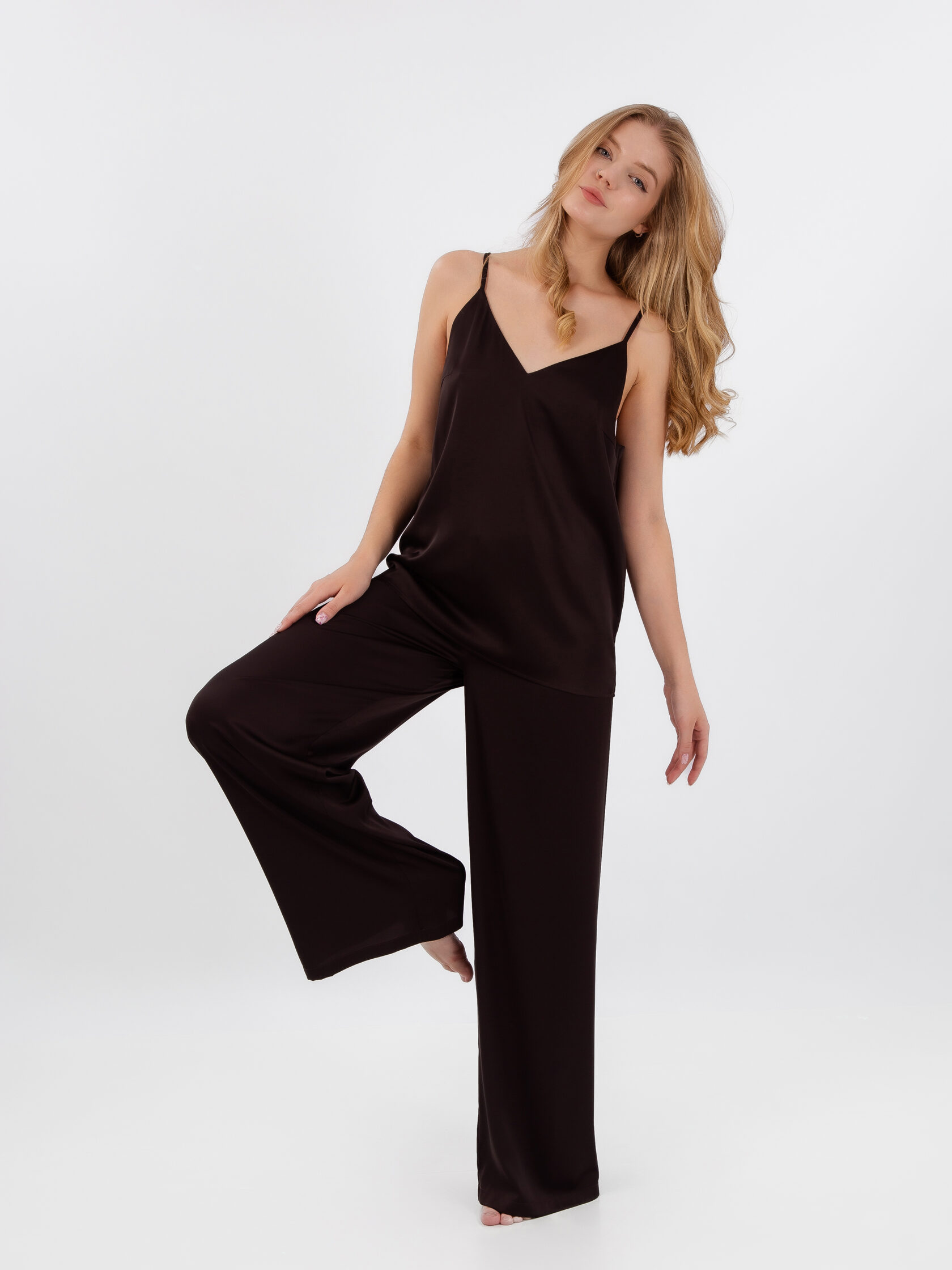 Топ на регулируемых лямках и брюки на регулируемой резинке. Под пижама может быть произведена из любой другой ткани, подходящей по технологии и в любых размерах. Товар поставляется с маркировкой Честный знак. Изделие продается как самостоятельная единица. Возможна поставка данной модели в комплекте с кимоно или рубашкой, как костюм в пижамном стиле или пижама. Цена указана при оптовом заказе от 50 до 1000 единиц. Свыше 1000 ед. стоимость обсуждается индивидуально. Для оценки качества, посадки модели по фигуре можно оформить заказ одной единицы, предварительно заключив договор.