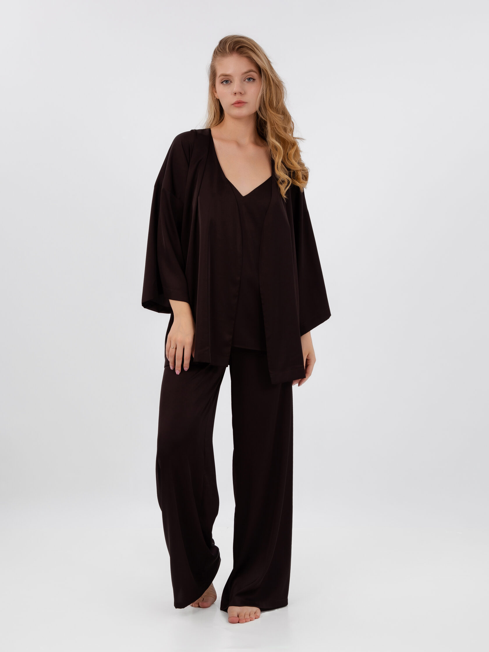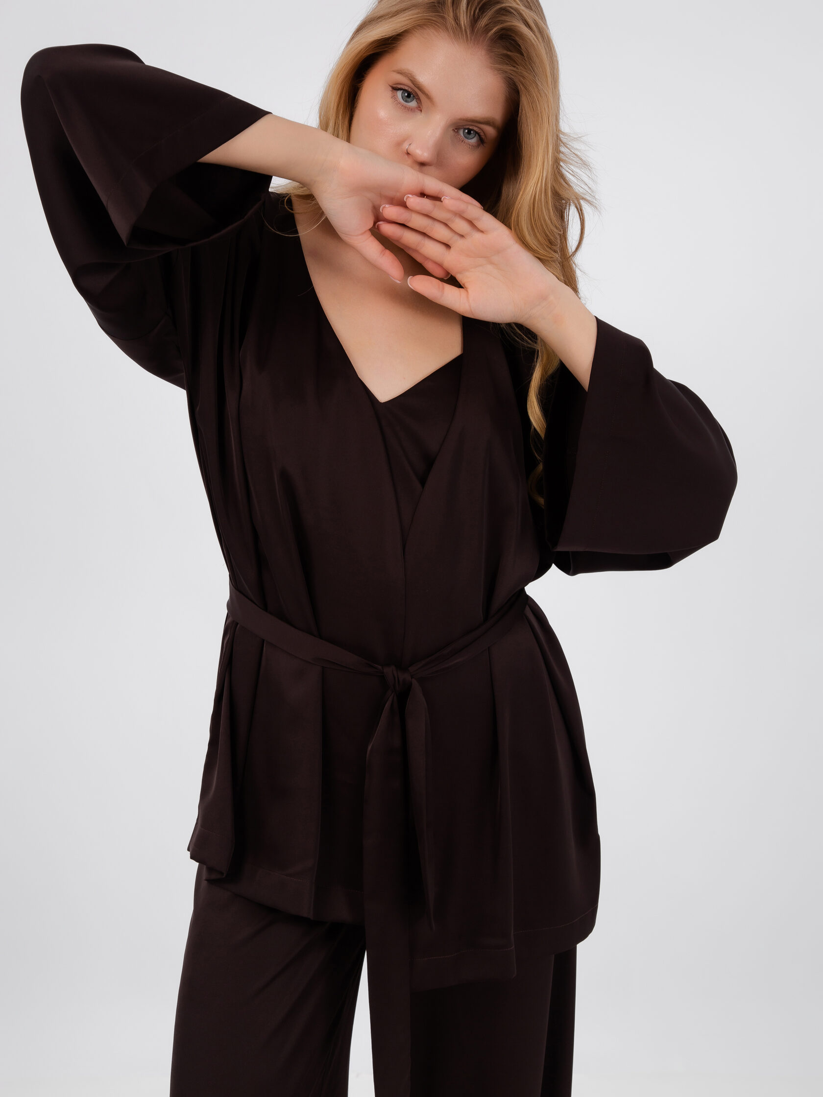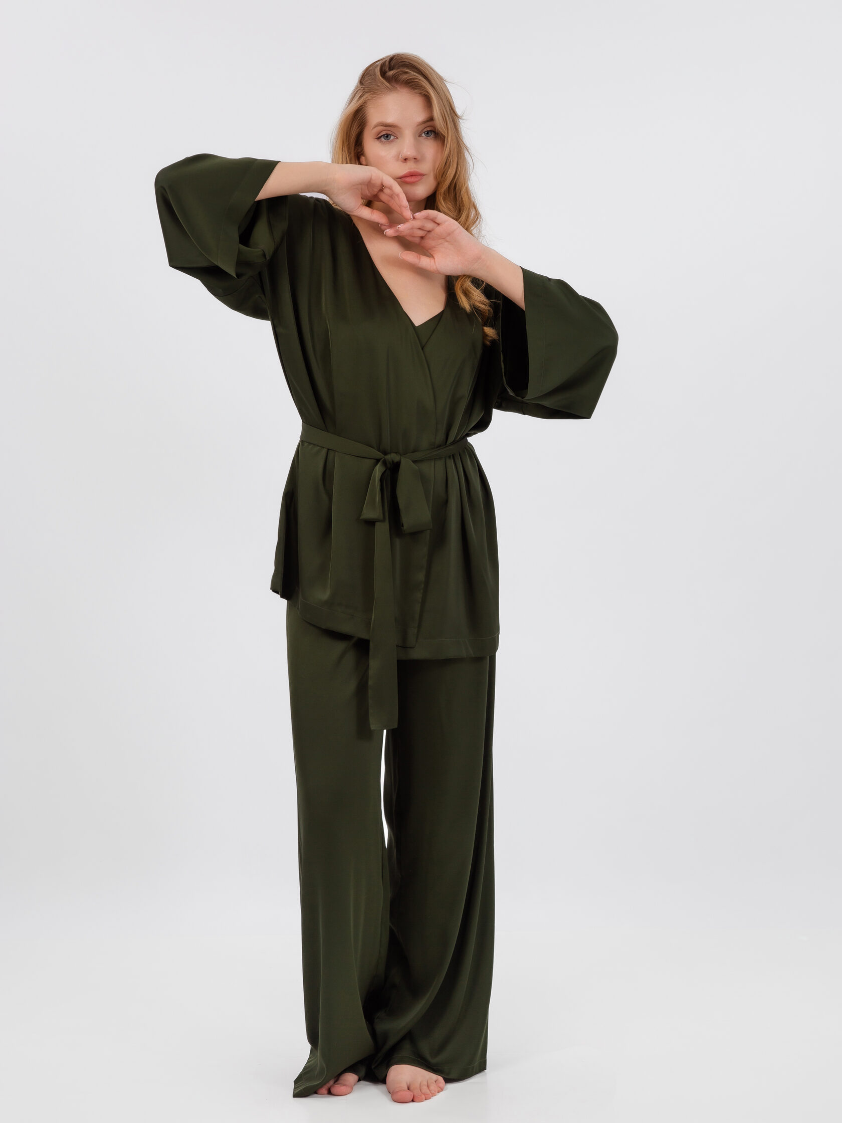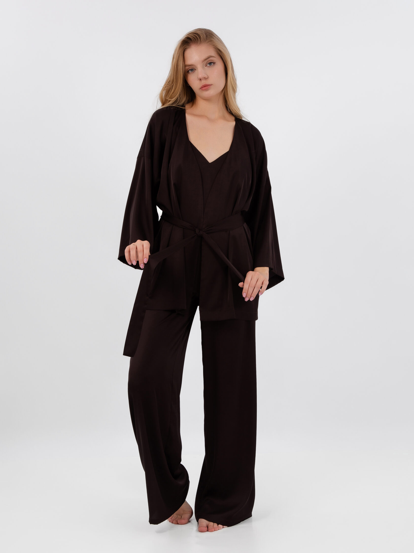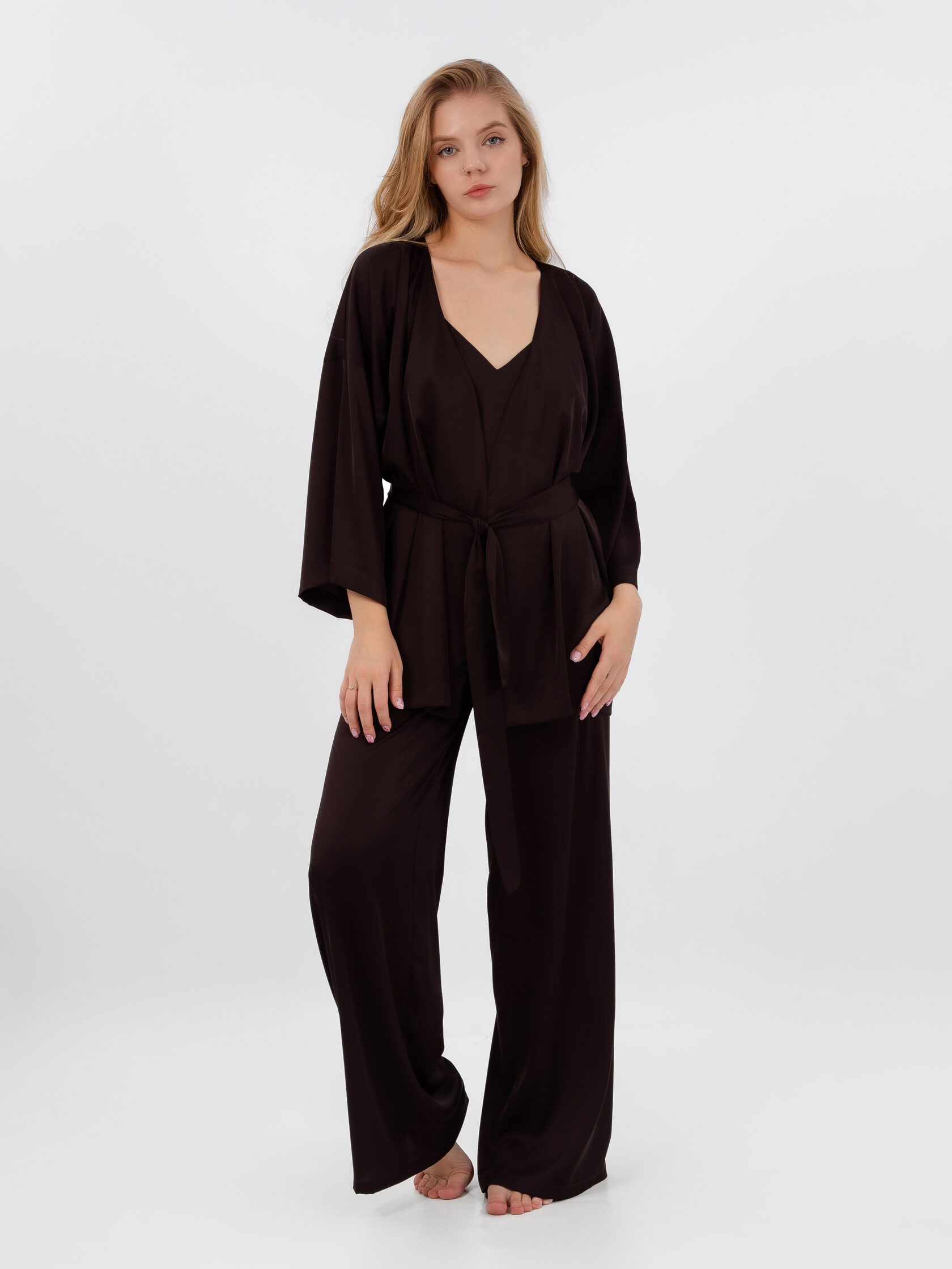 Костюм (топ, брюки, короткое кимоно с поясом) в пижамном стиле