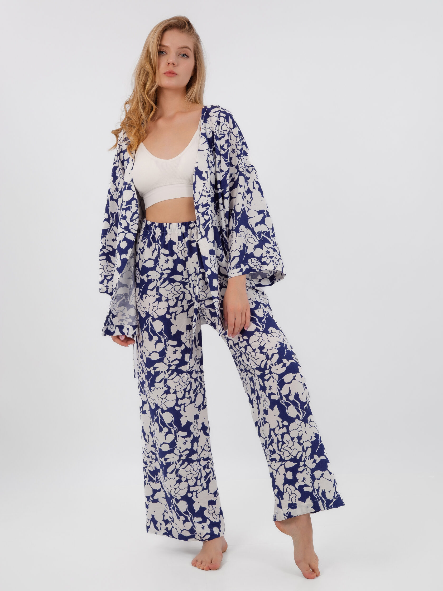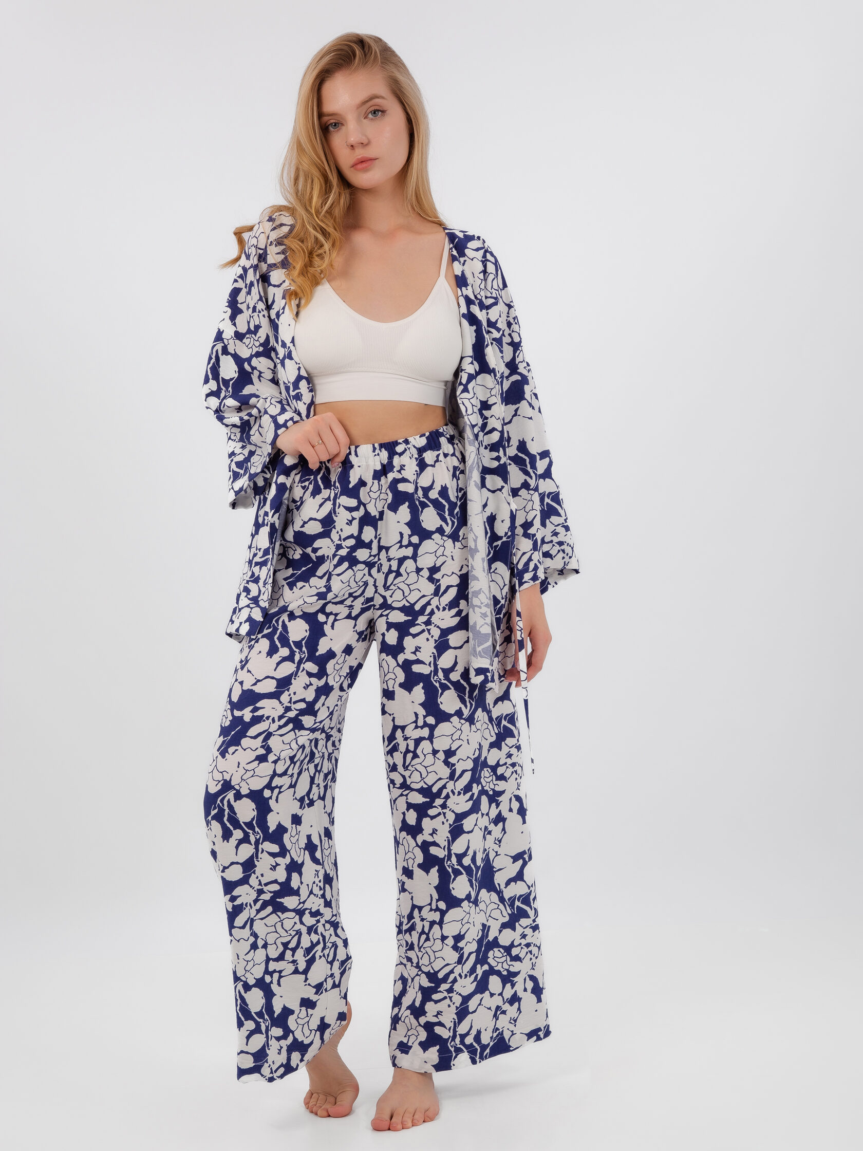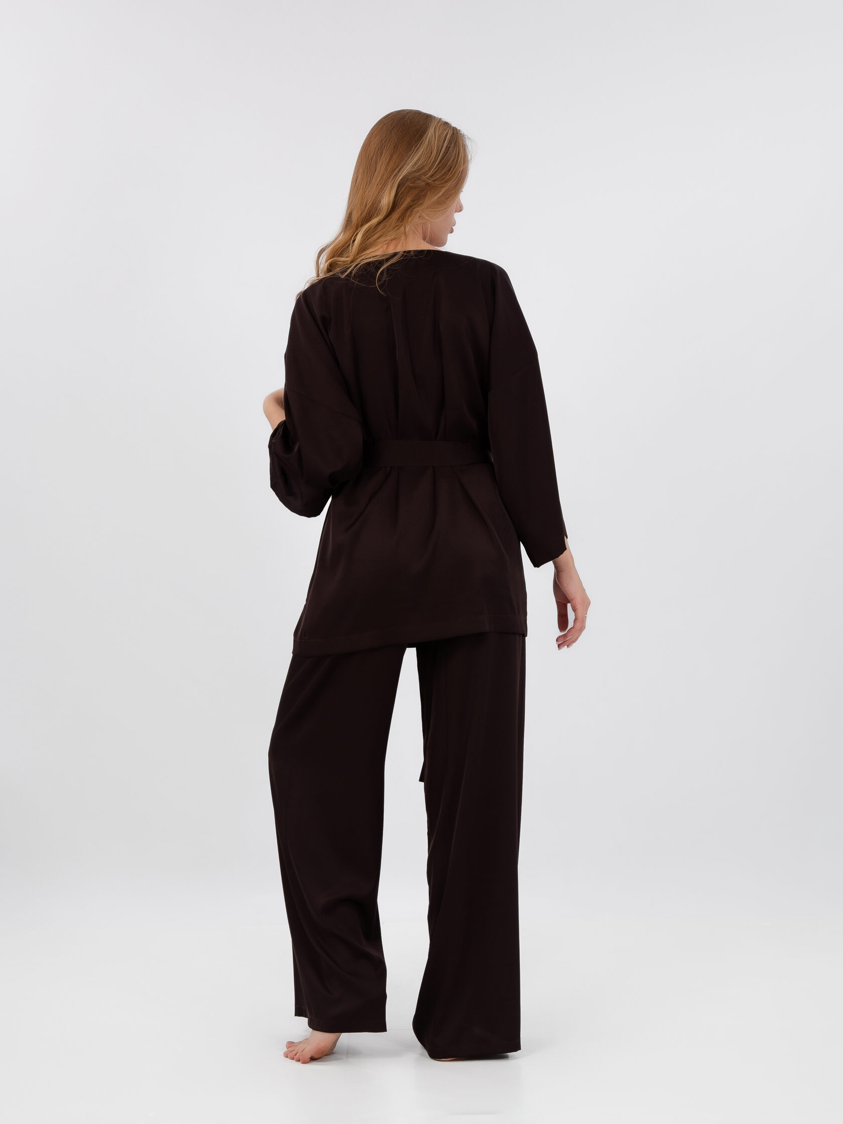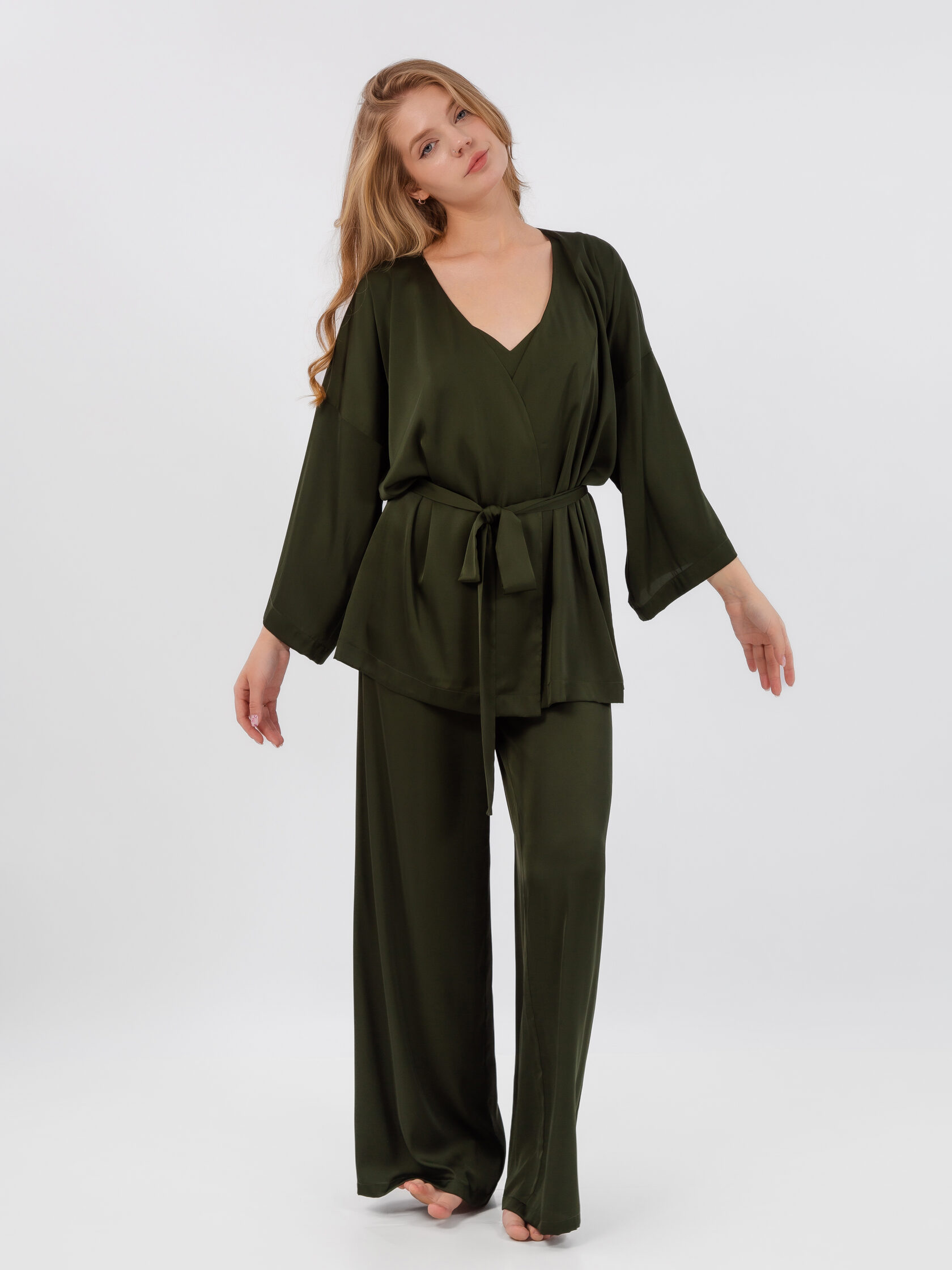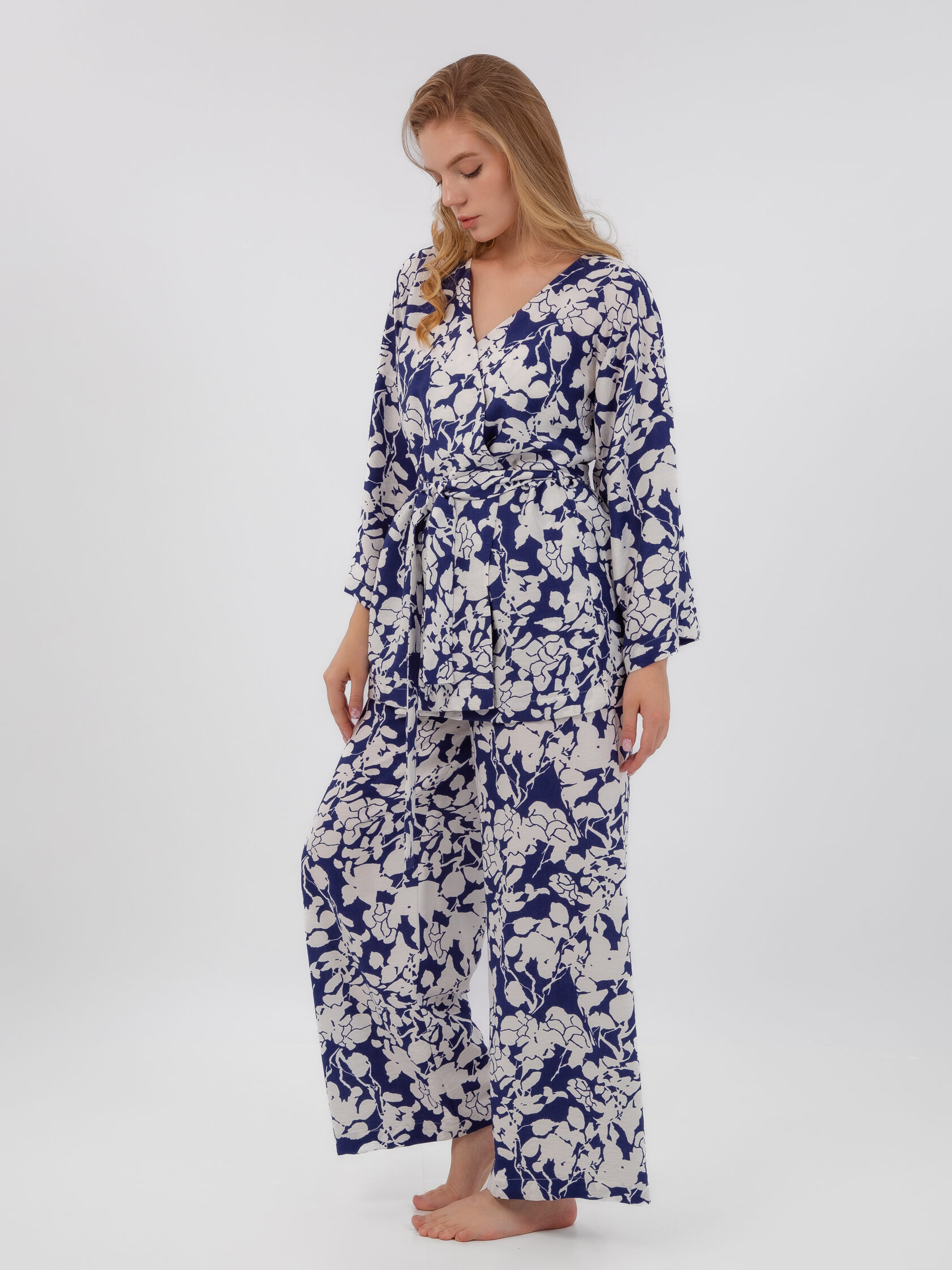 Костюм (топ, брюки, короткое кимоно с поясом) в пижамном стиле