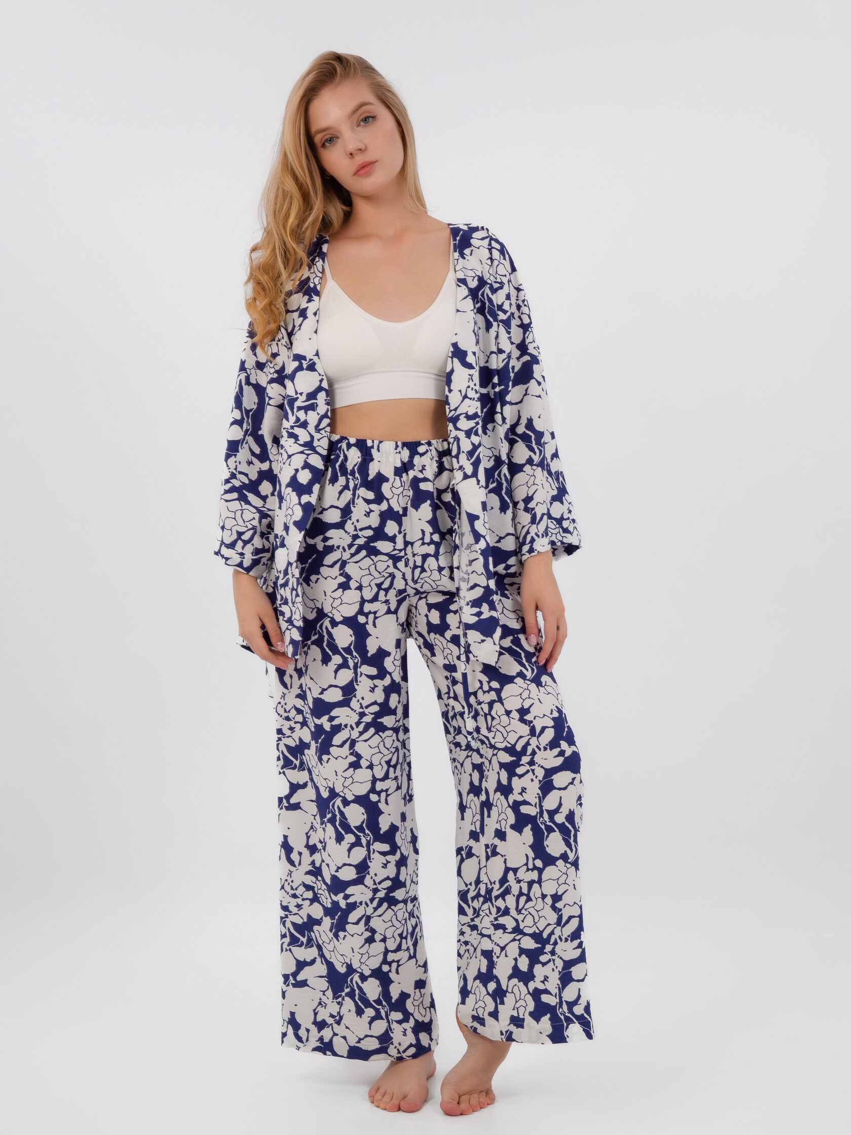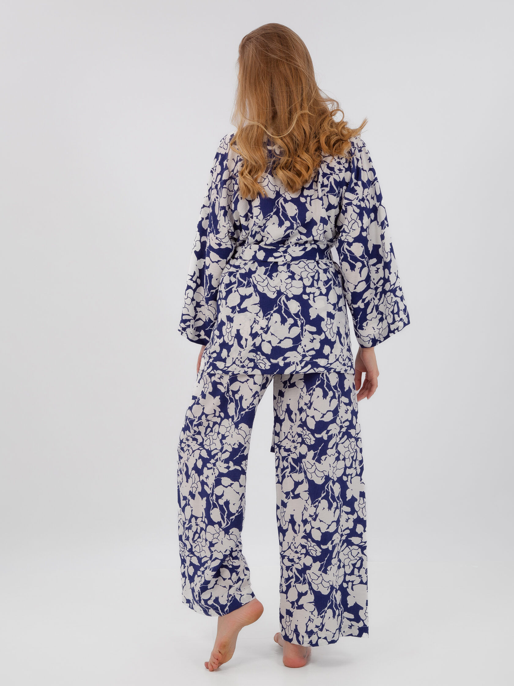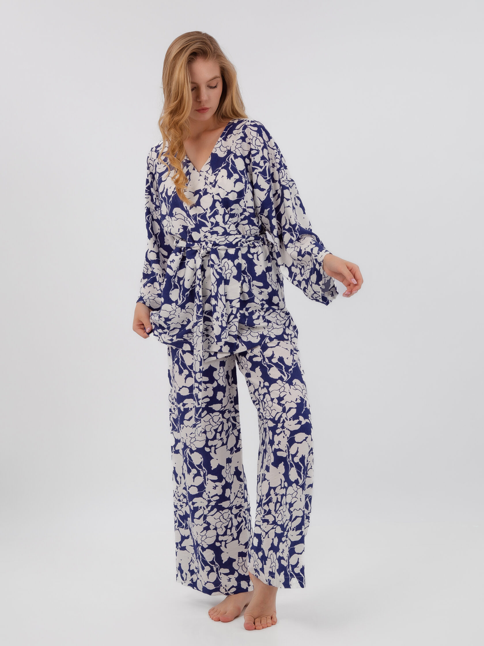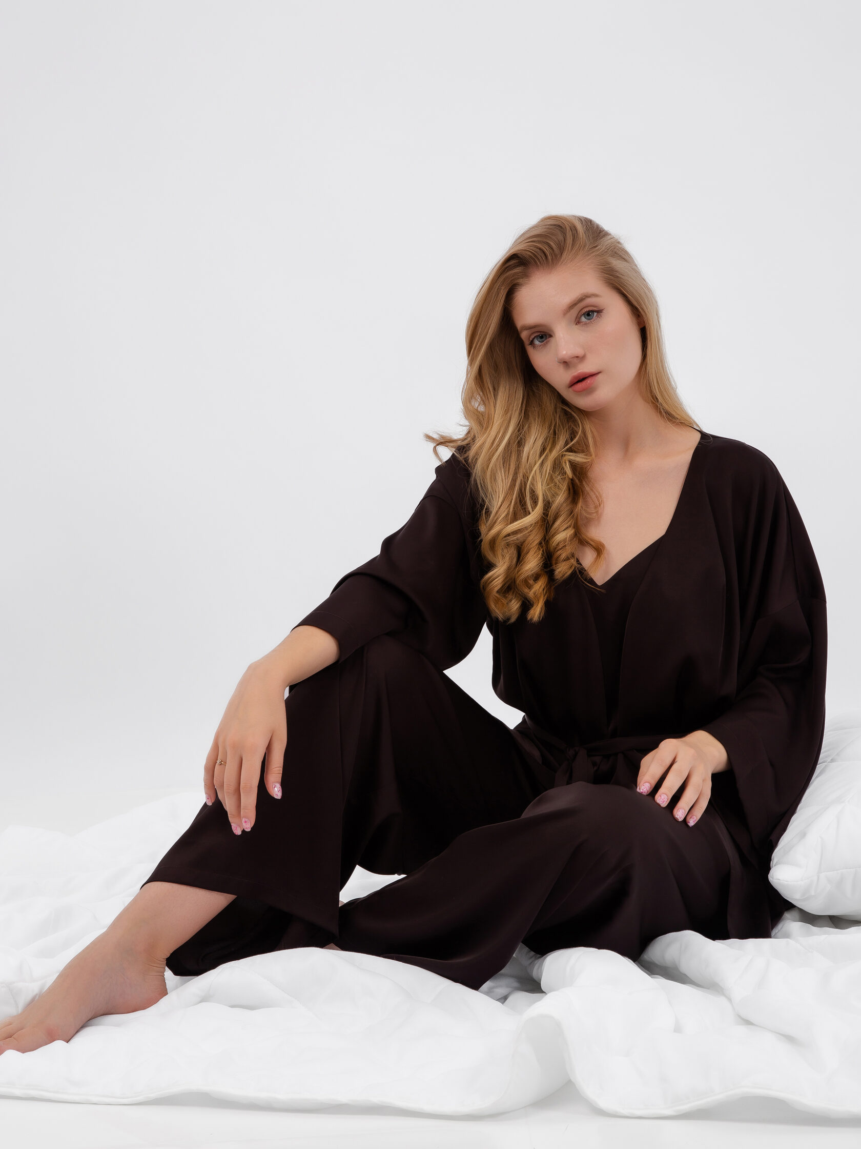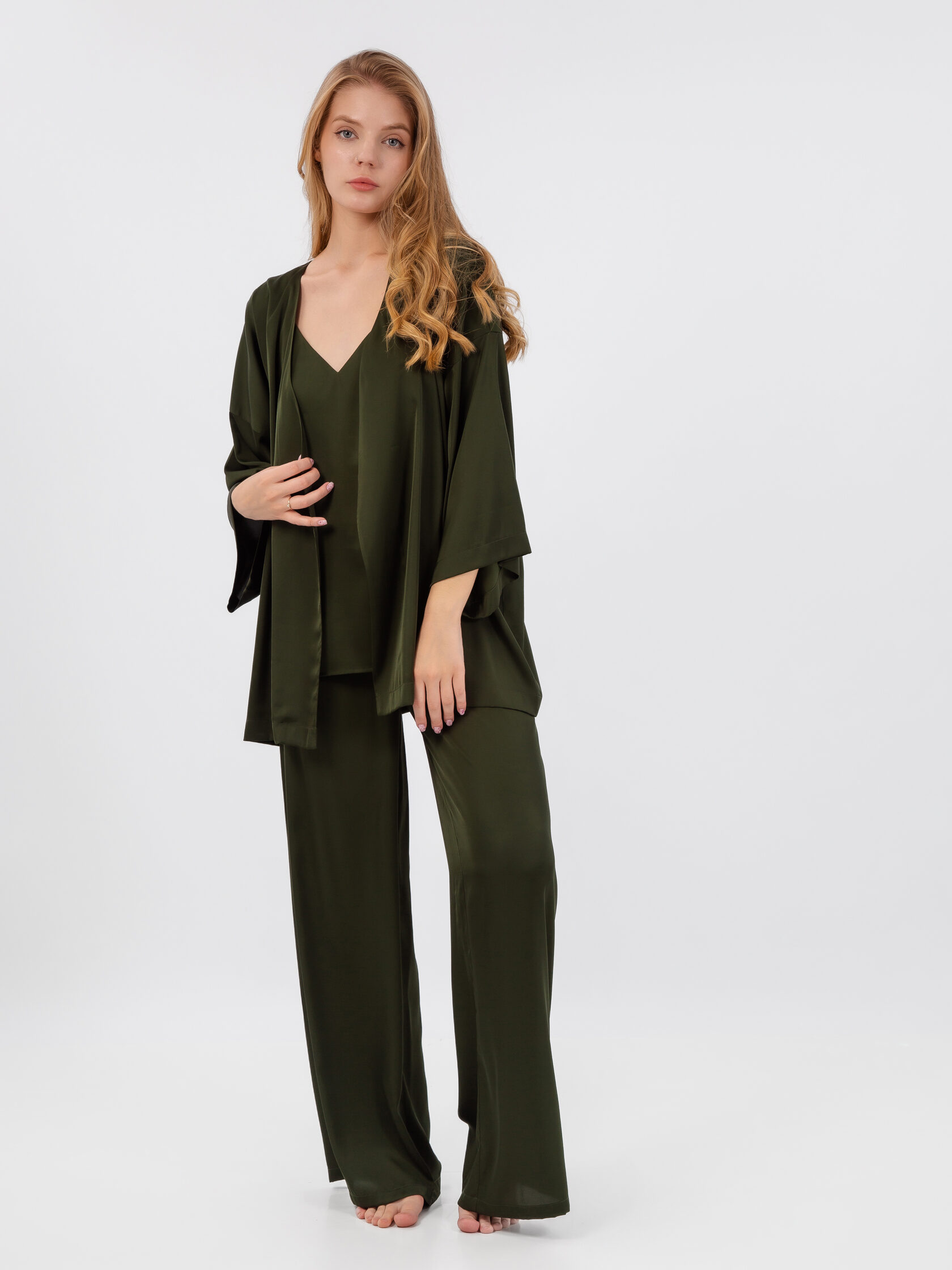 Костюм (топ, брюки, короткое кимоно с поясом) в пижамном стиле