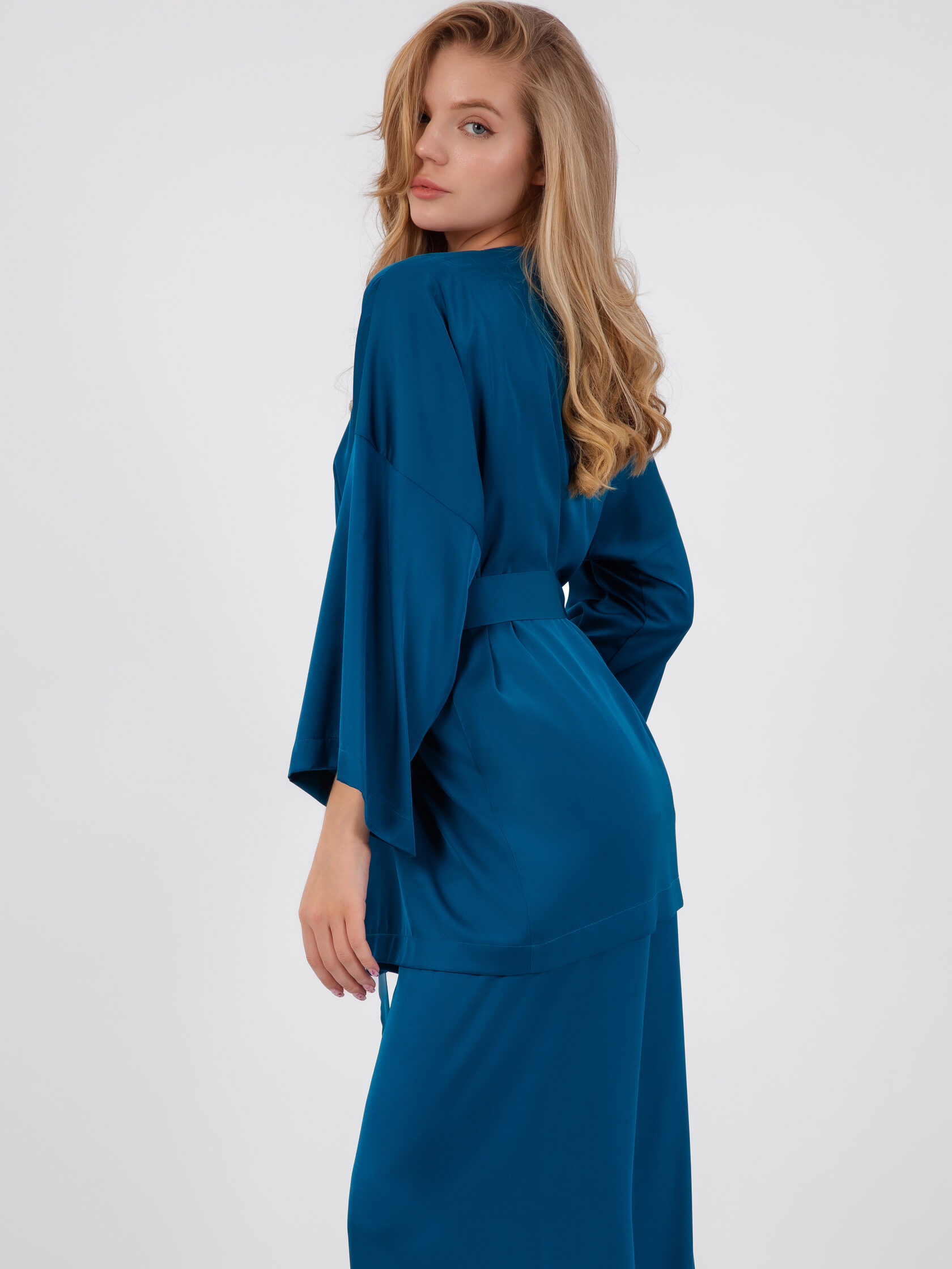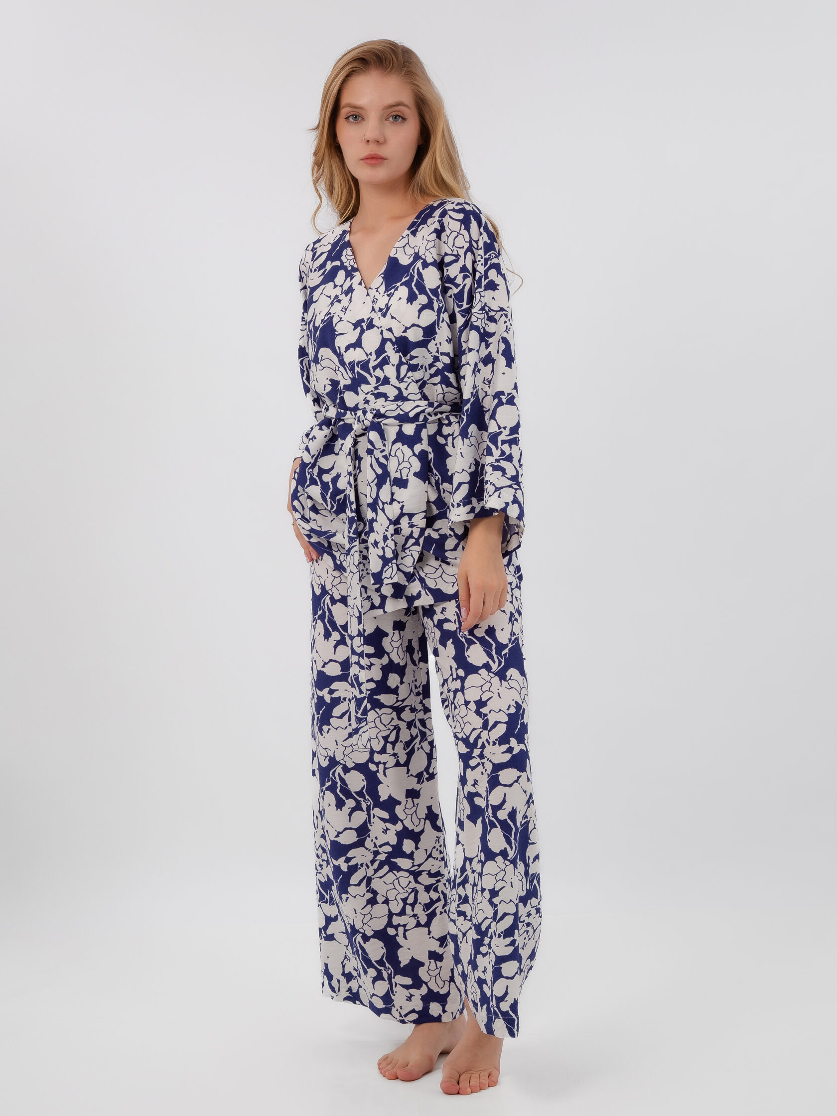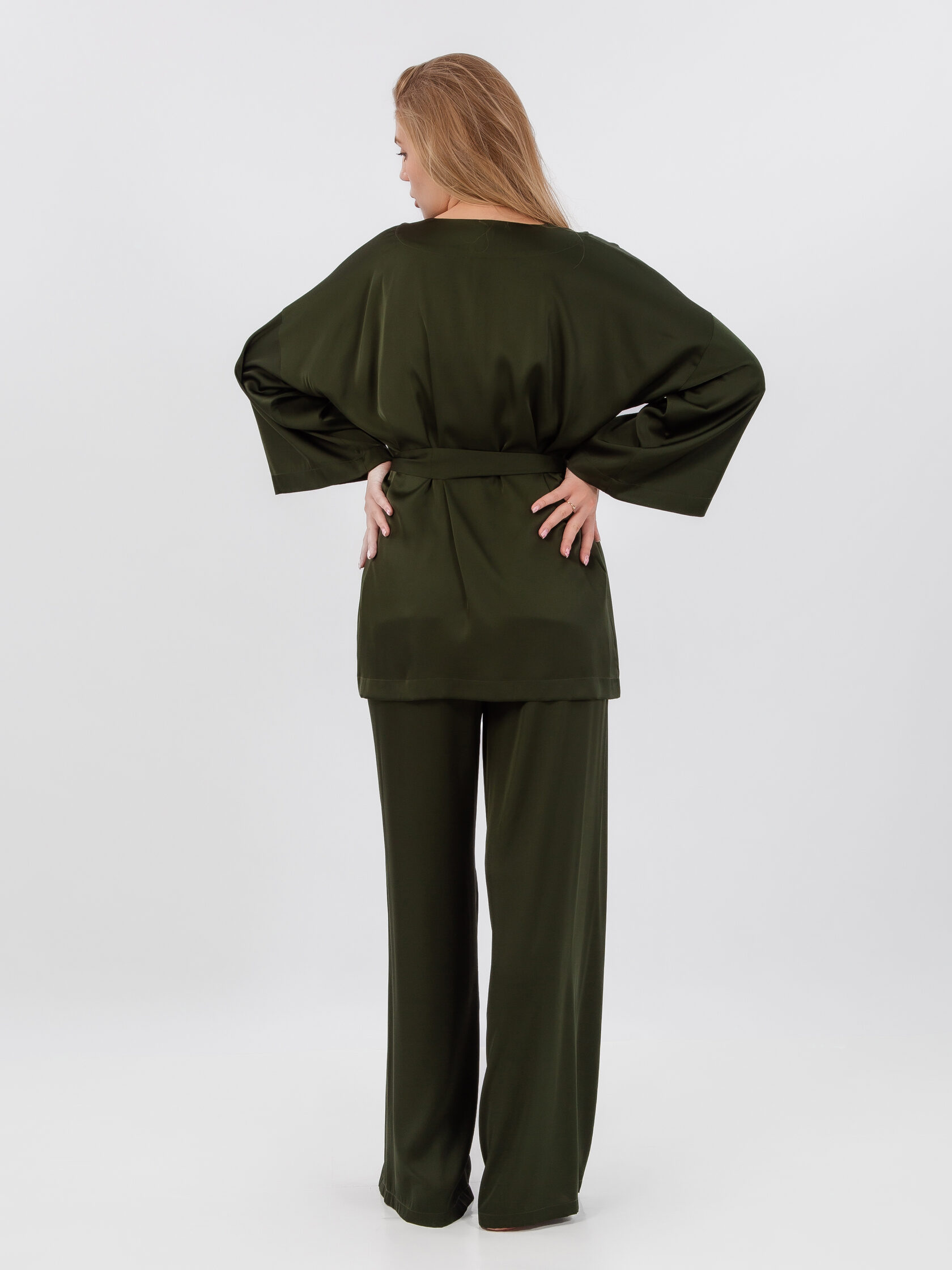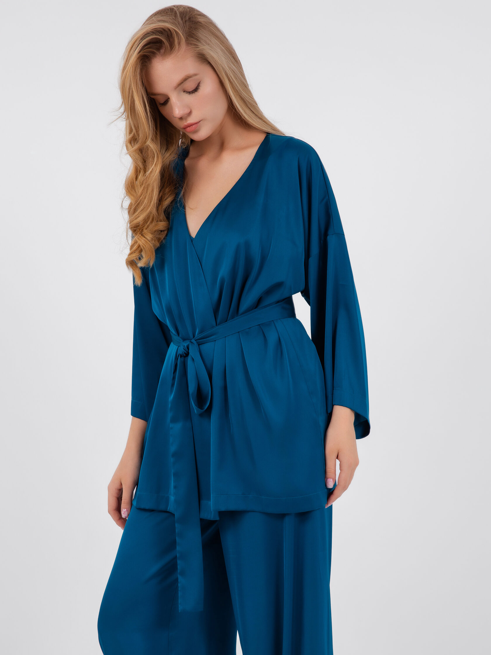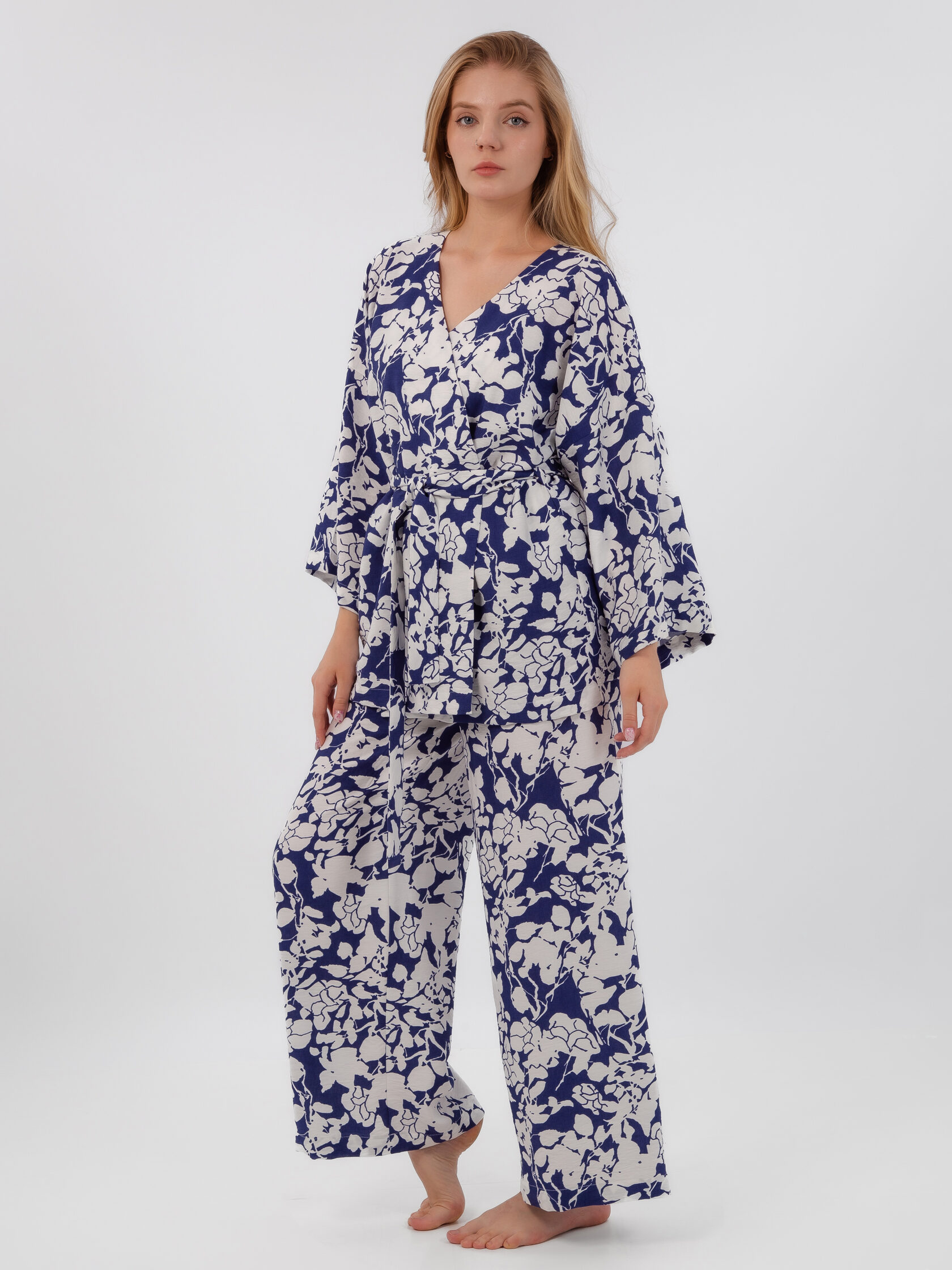 Костюм (топ, брюки, короткое кимоно с поясом) в пижамном стиле