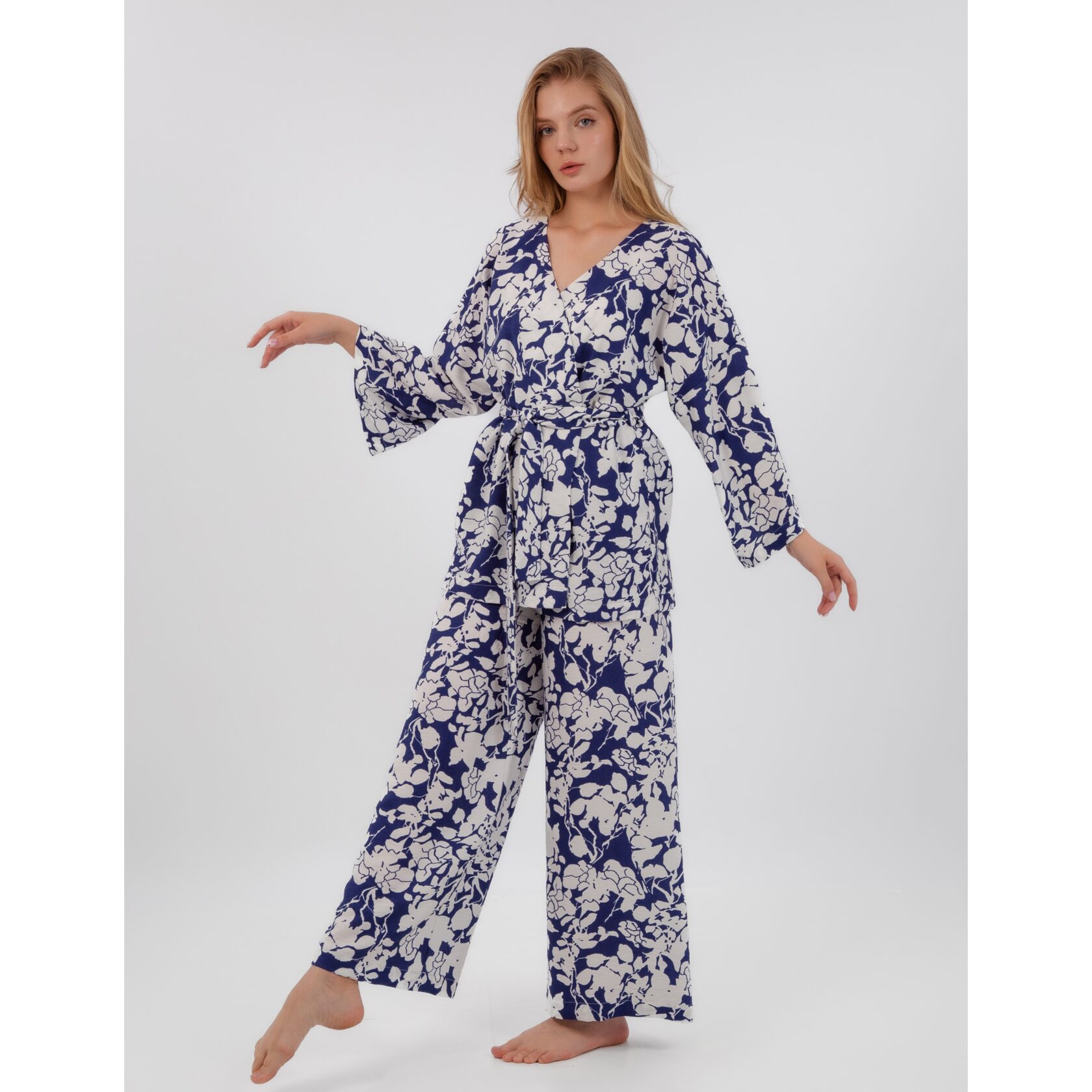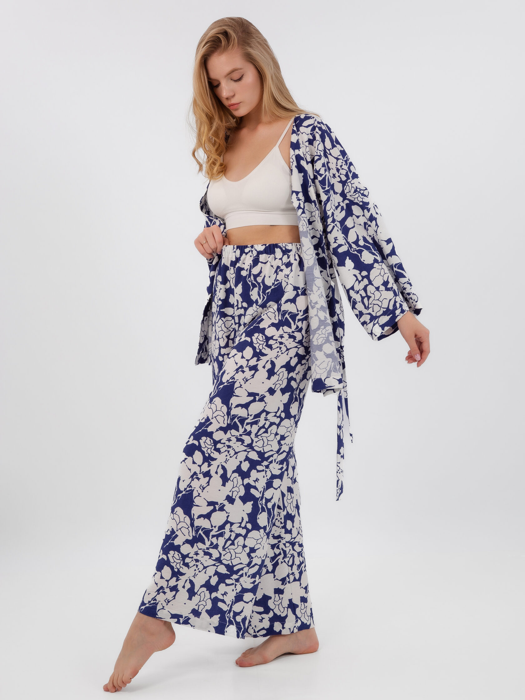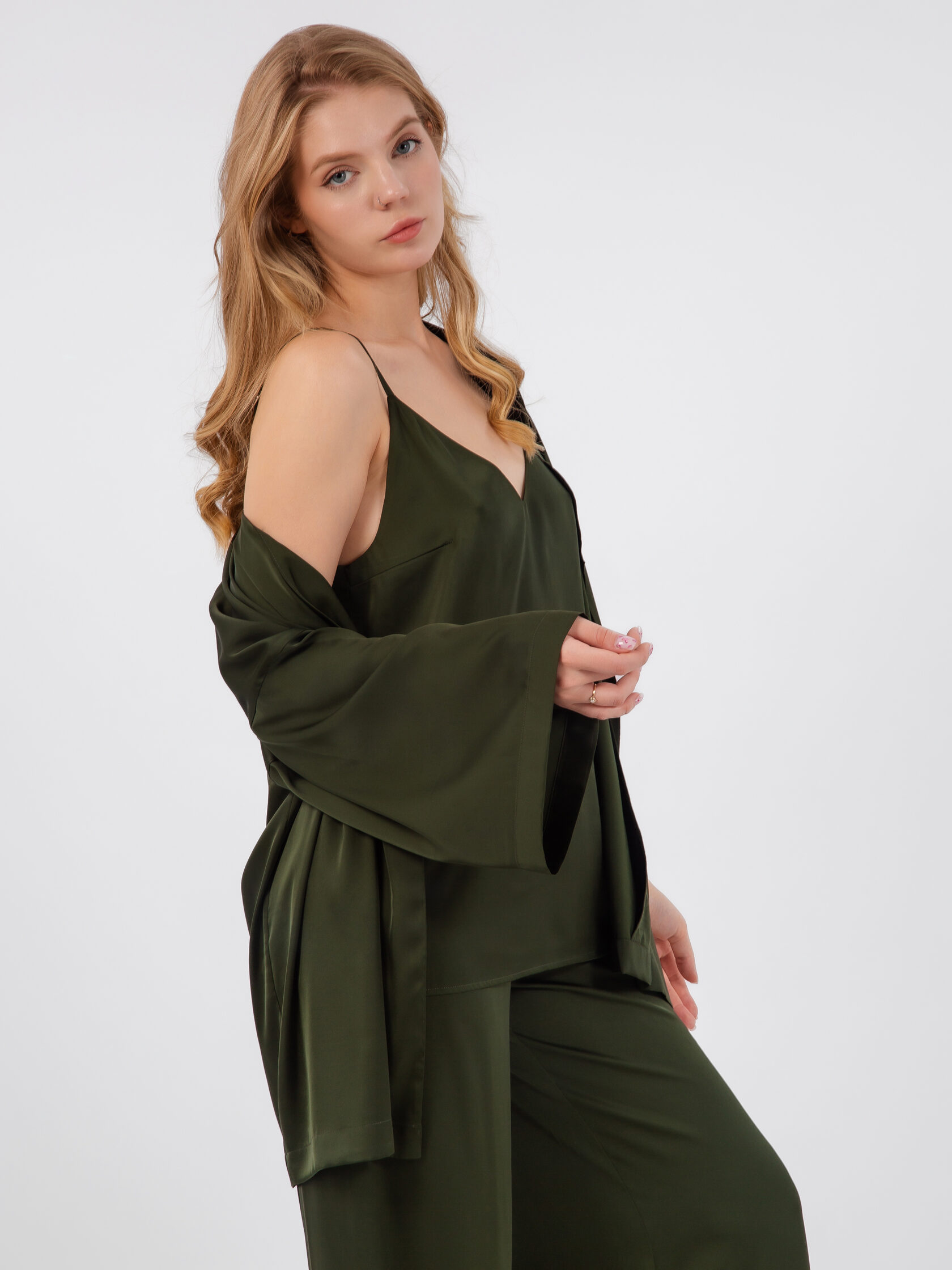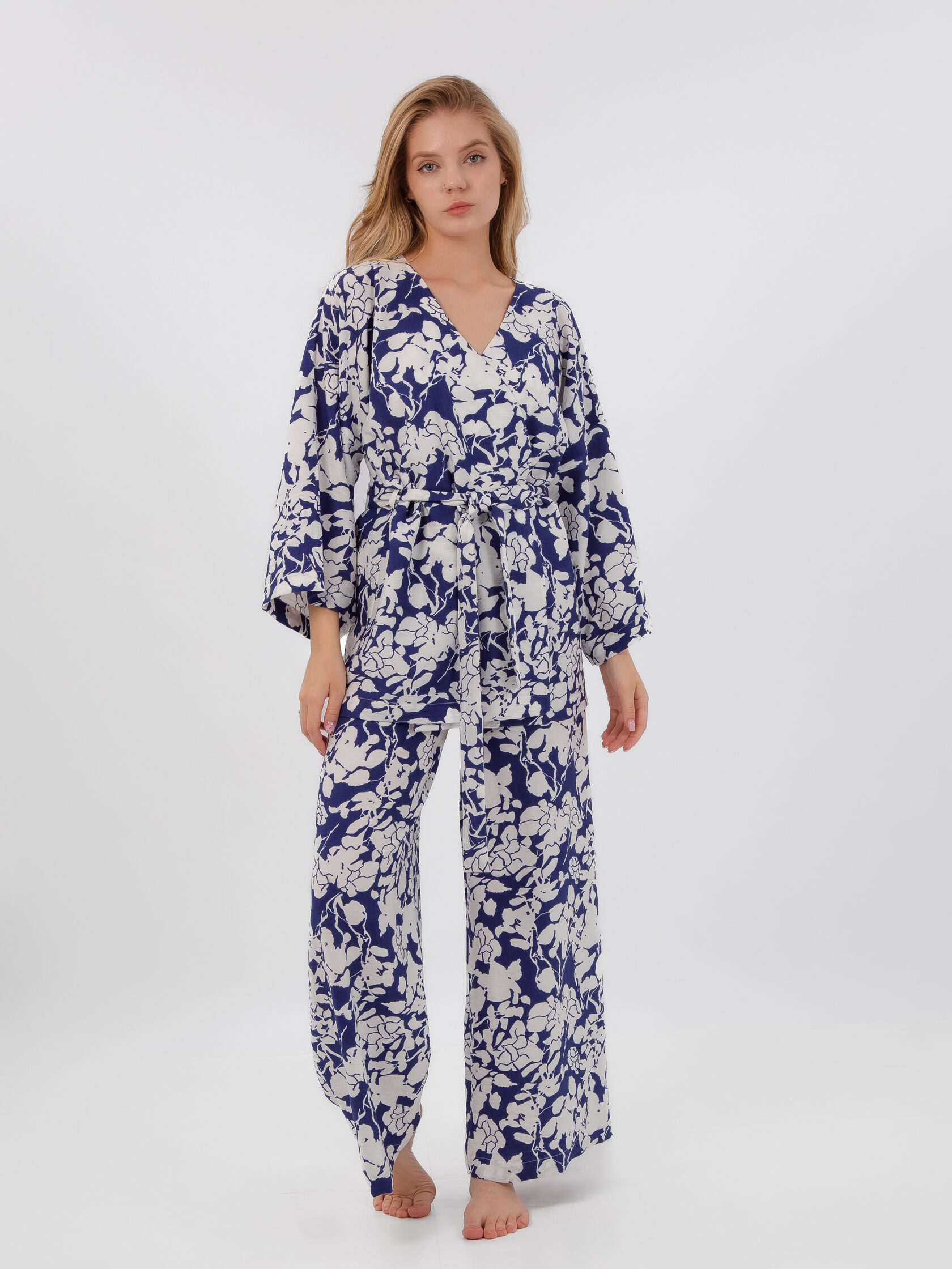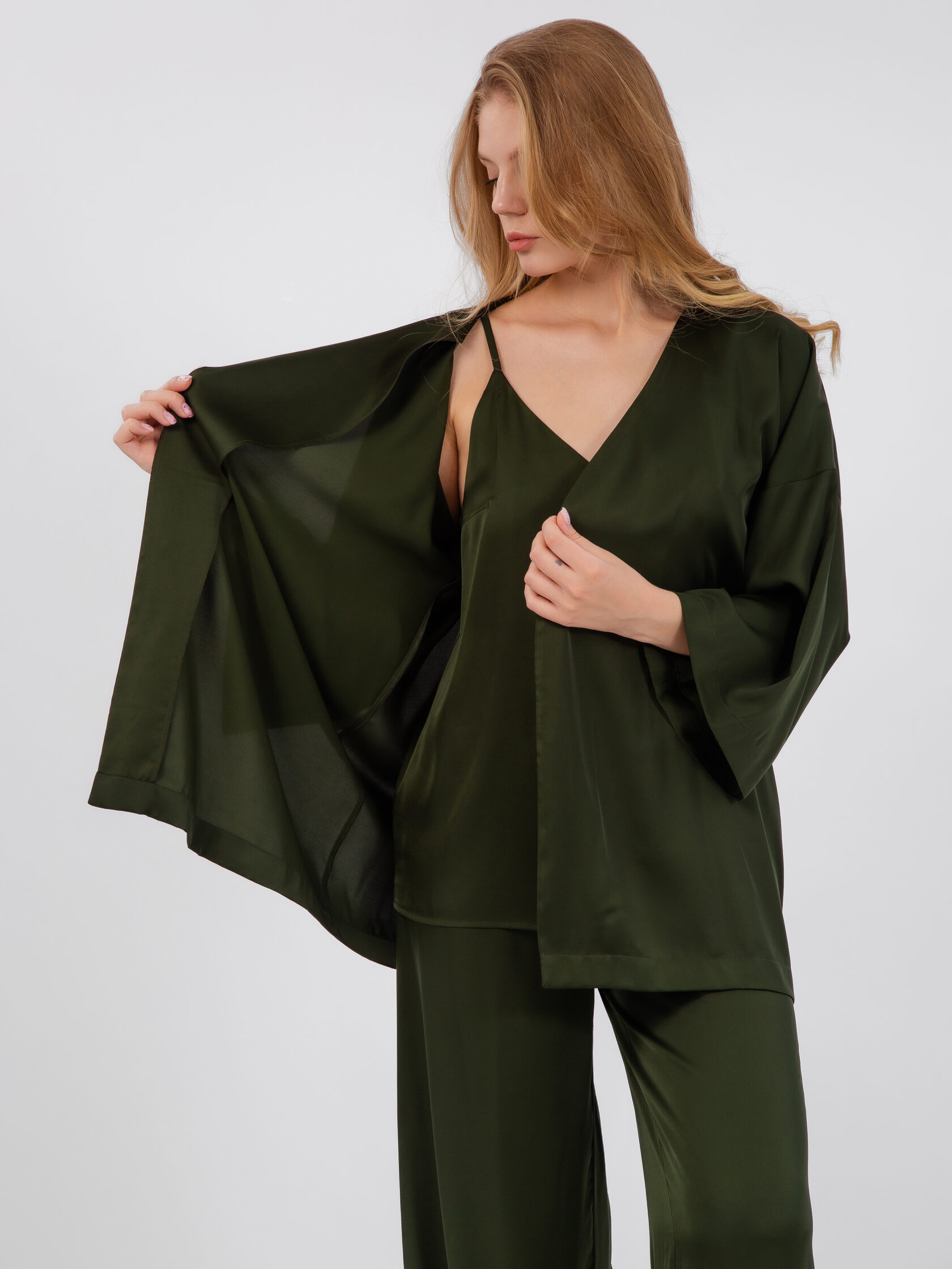 Костюм (топ, брюки, короткое кимоно с поясом) в пижамном стиле