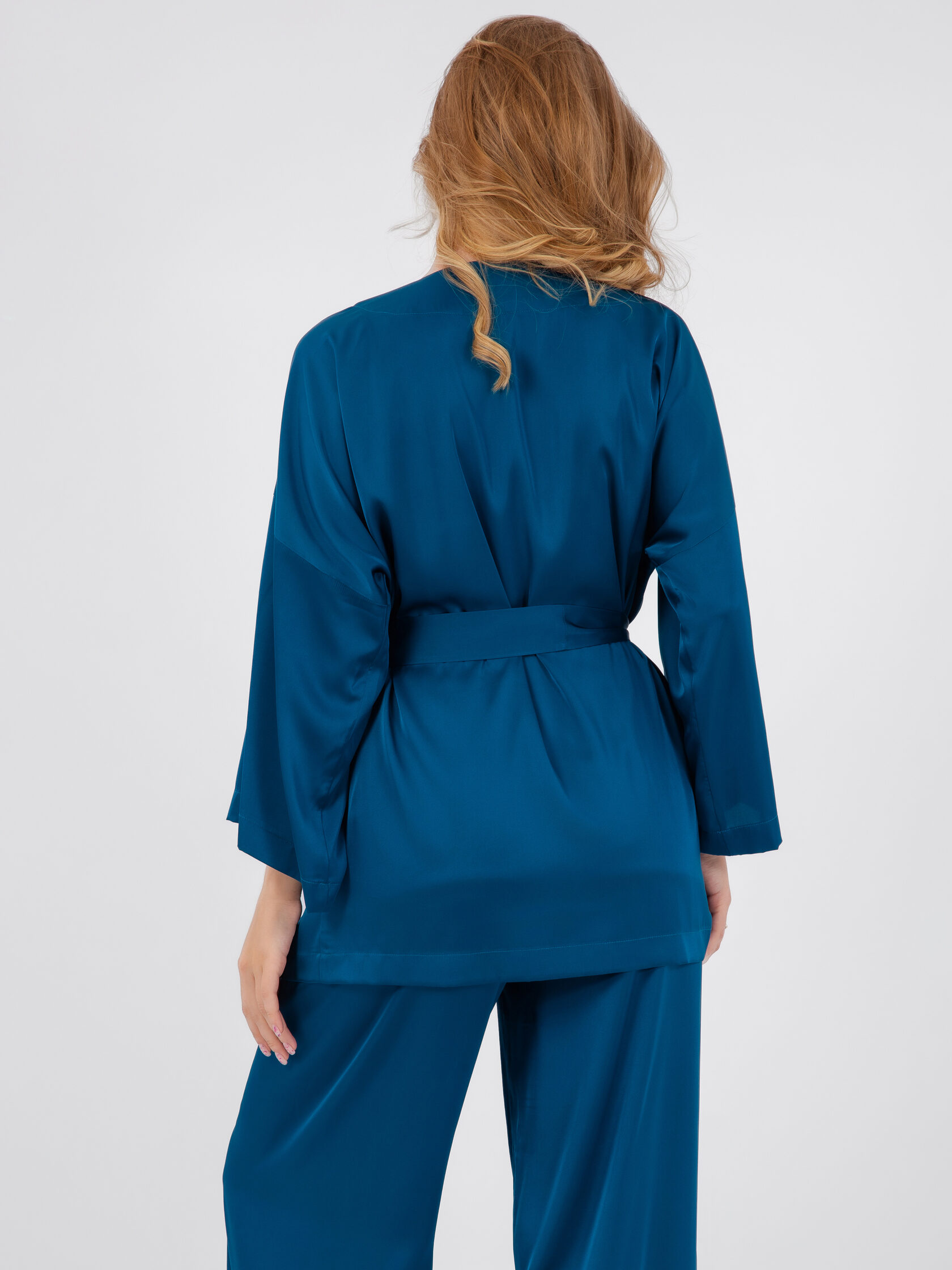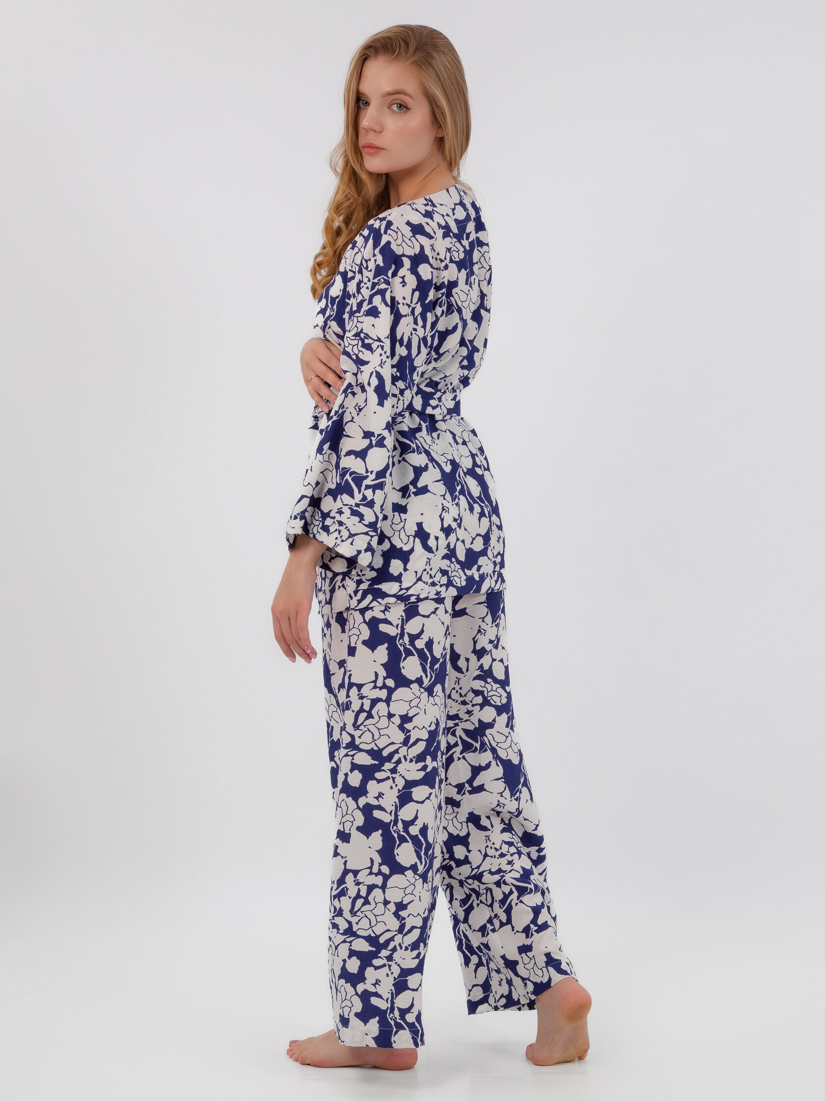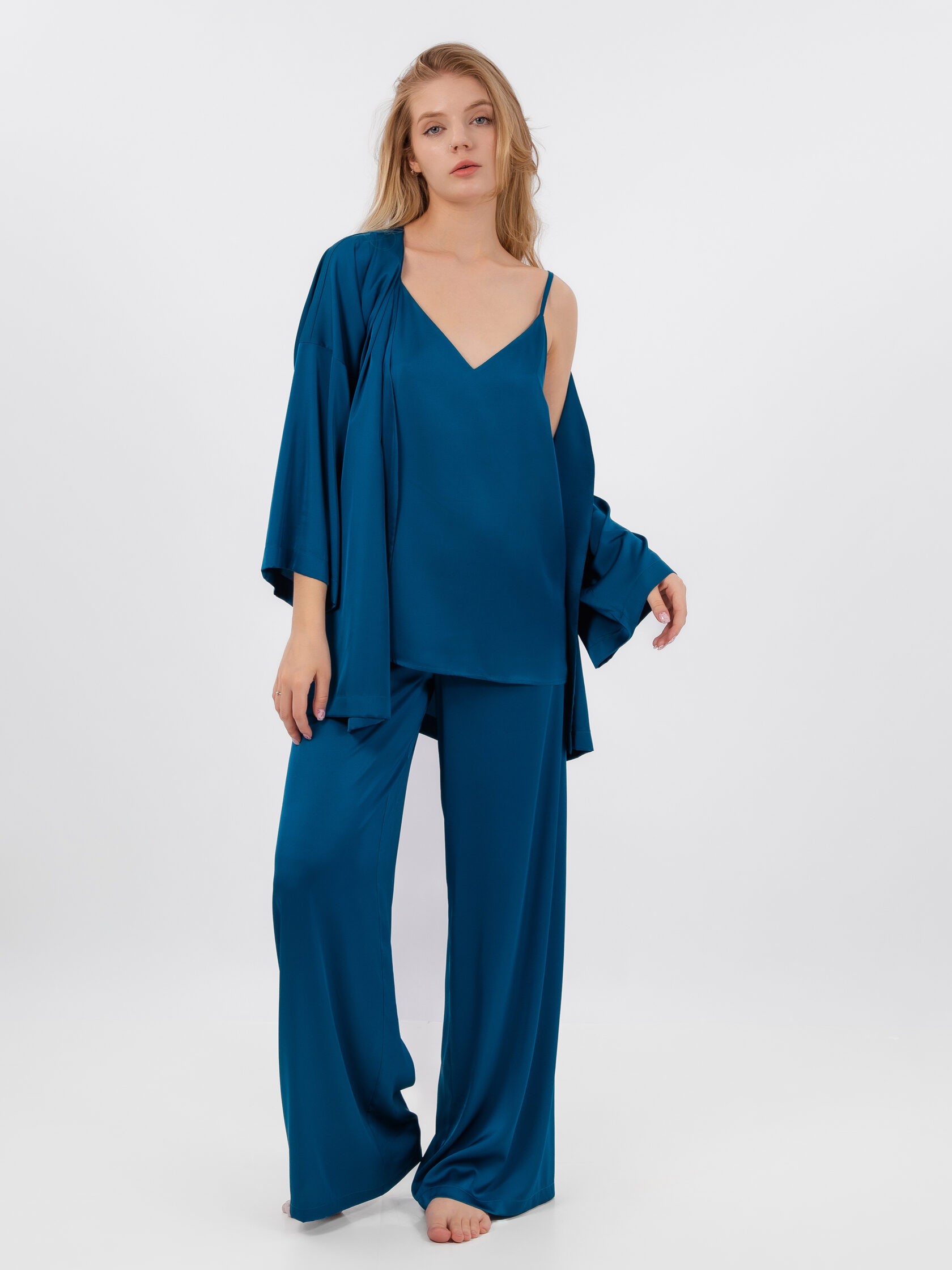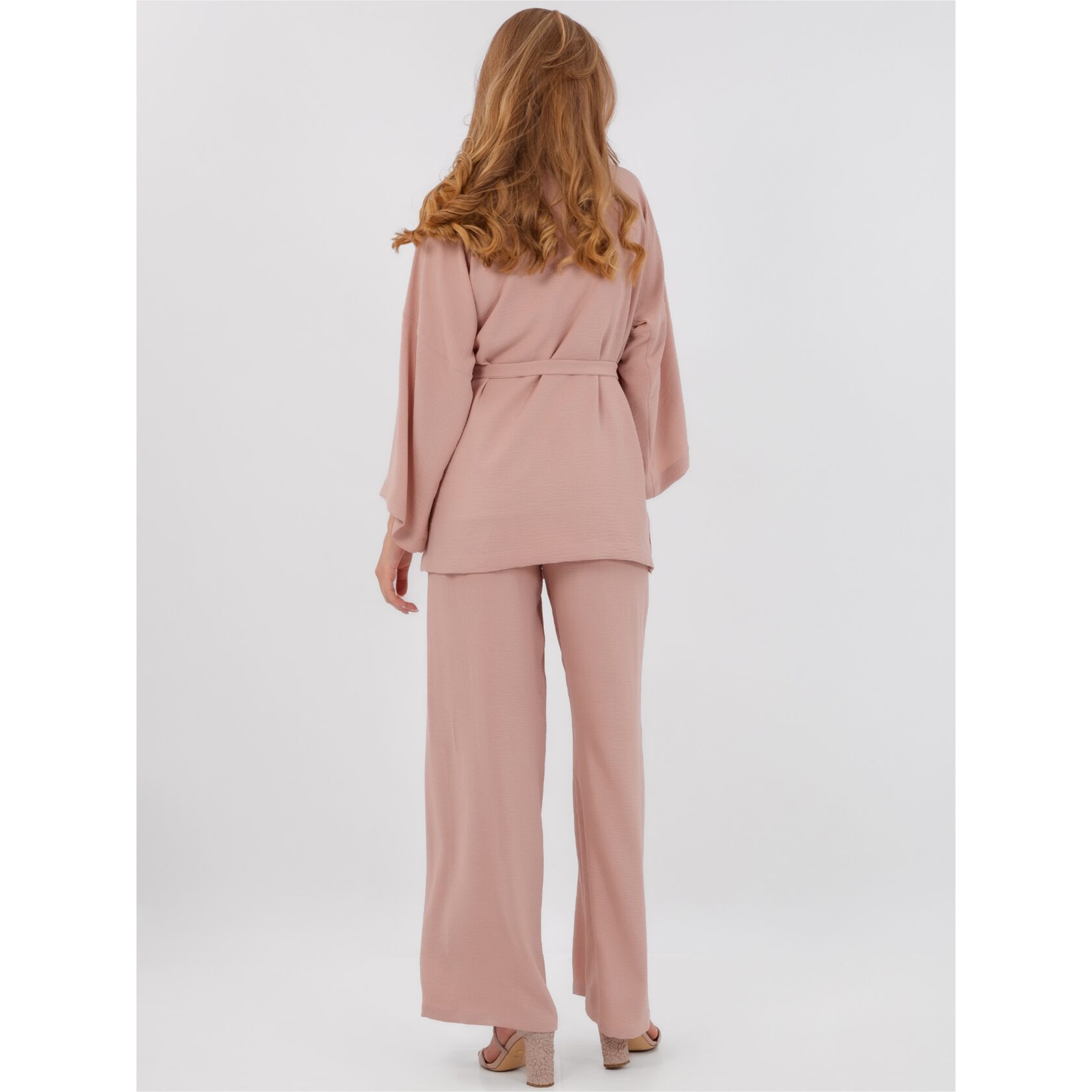 Костюм (топ, брюки, короткое кимоно с поясом) в пижамном стиле