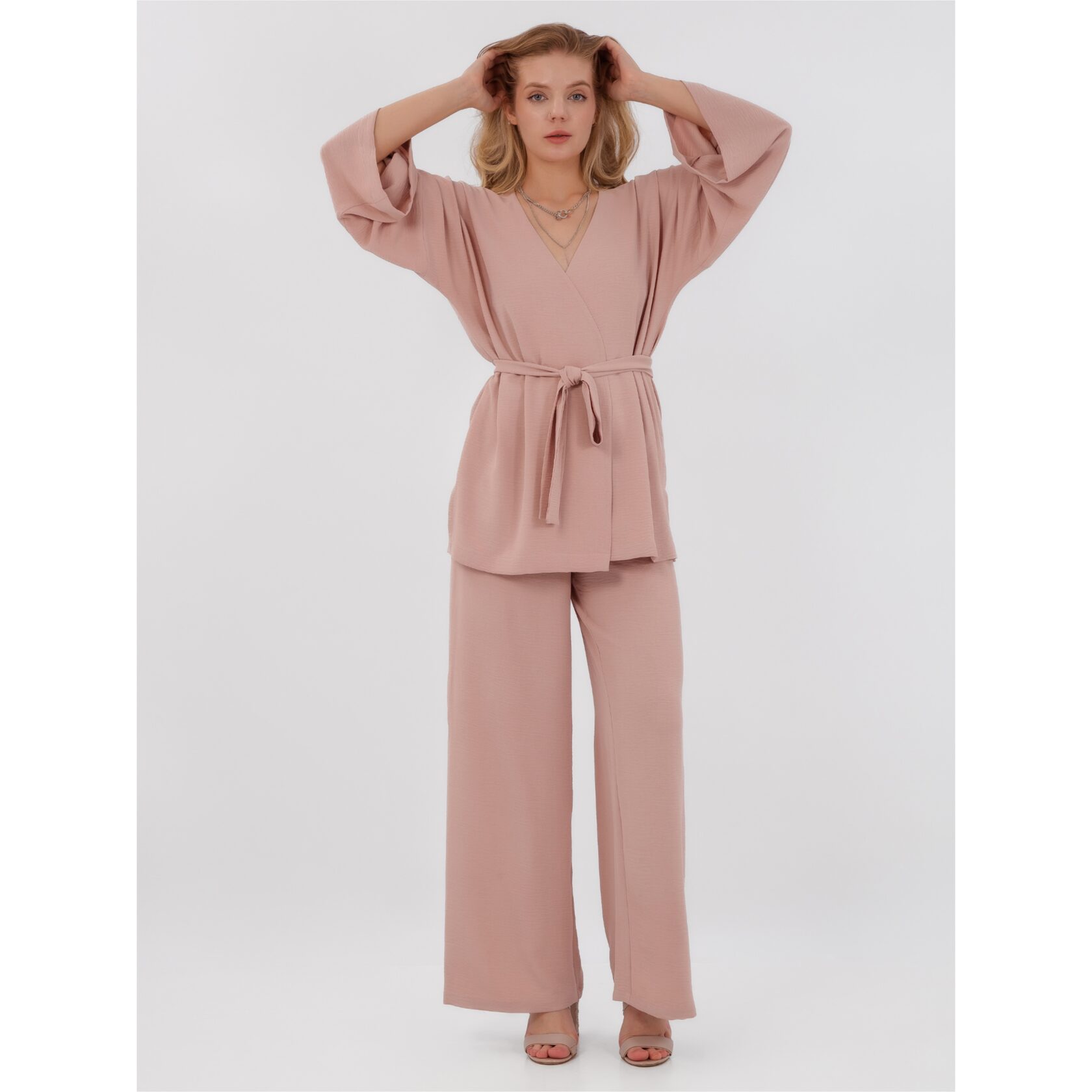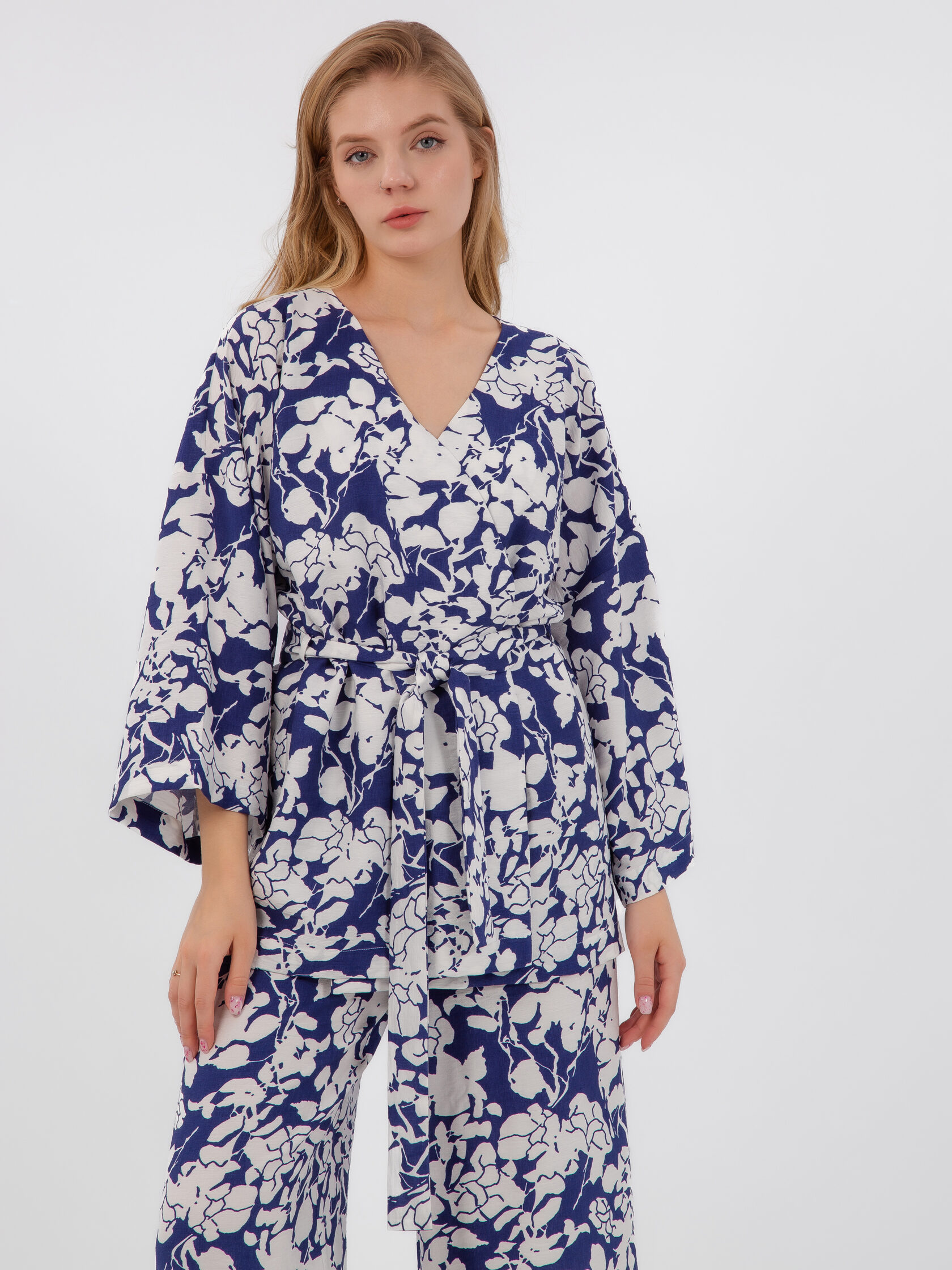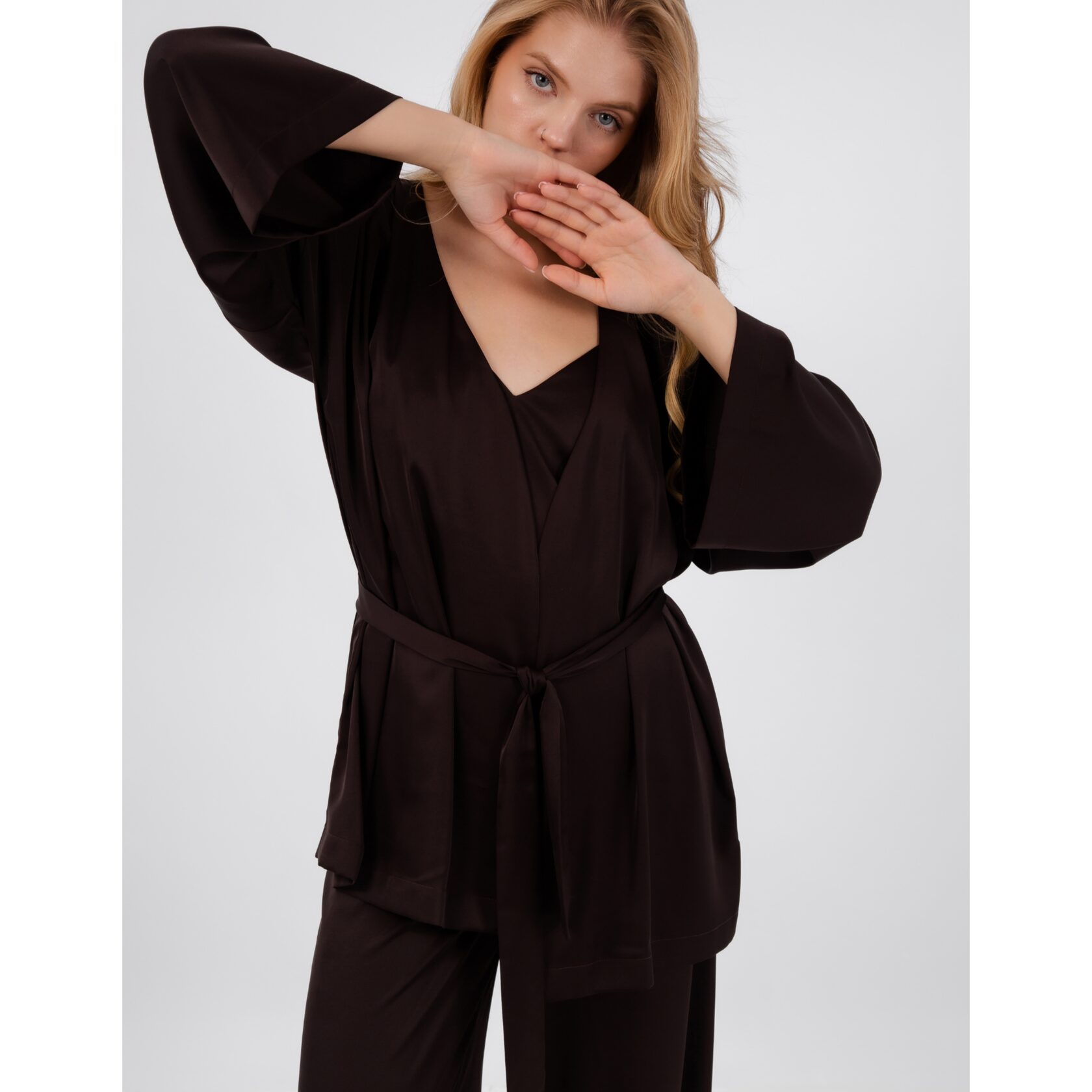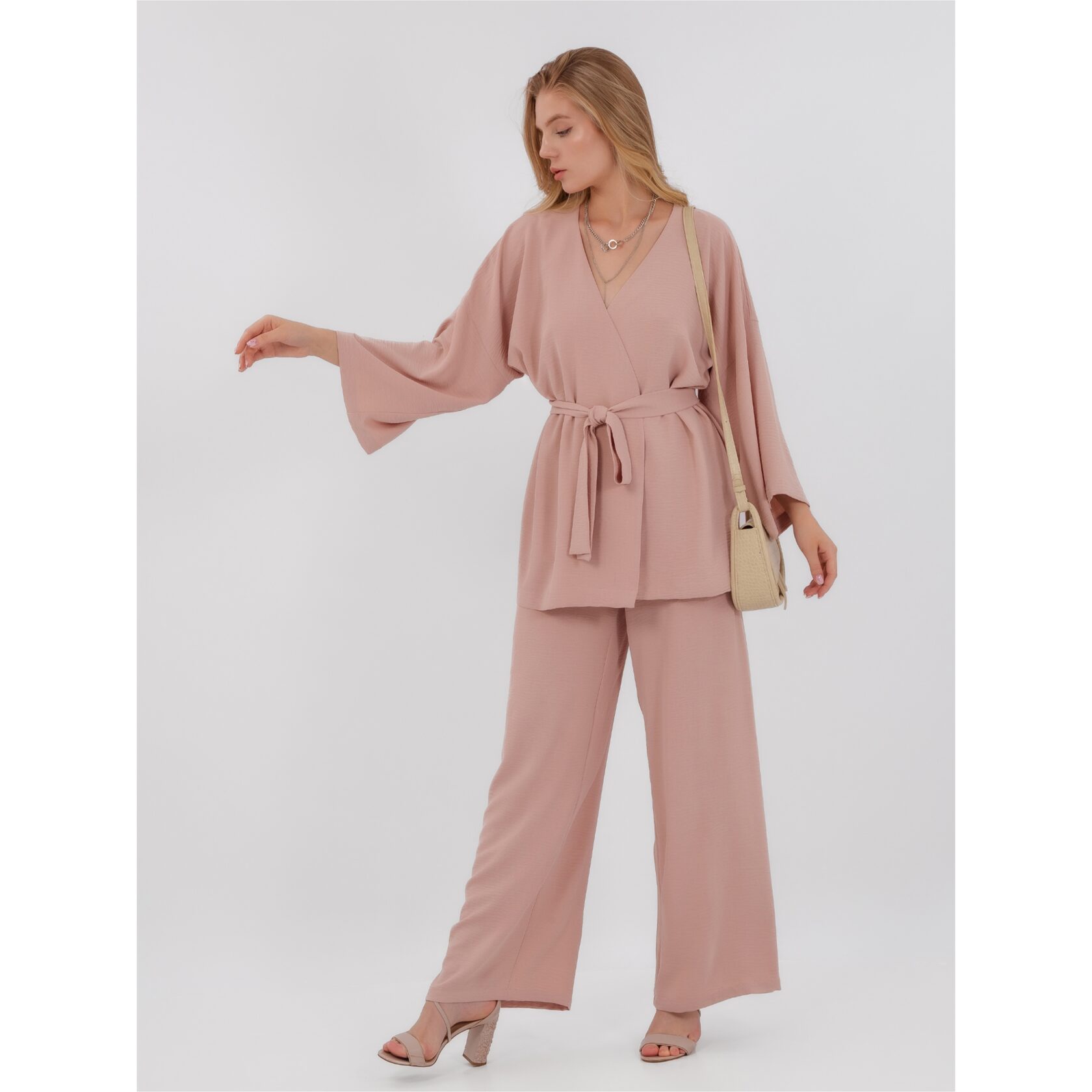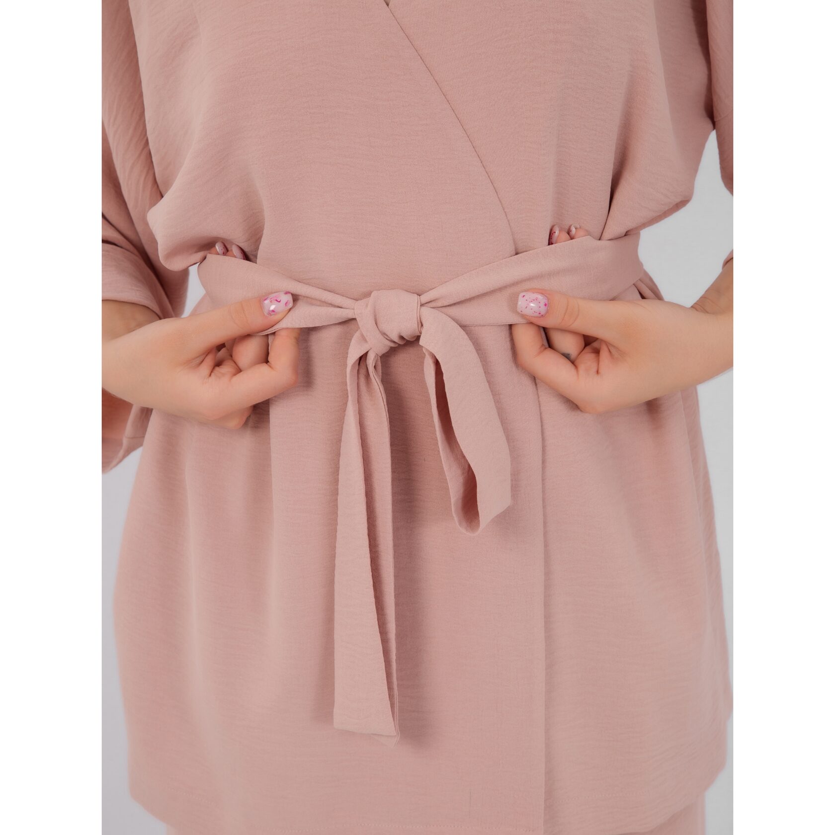 Костюм (топ, брюки, короткое кимоно с поясом) в пижамном стиле