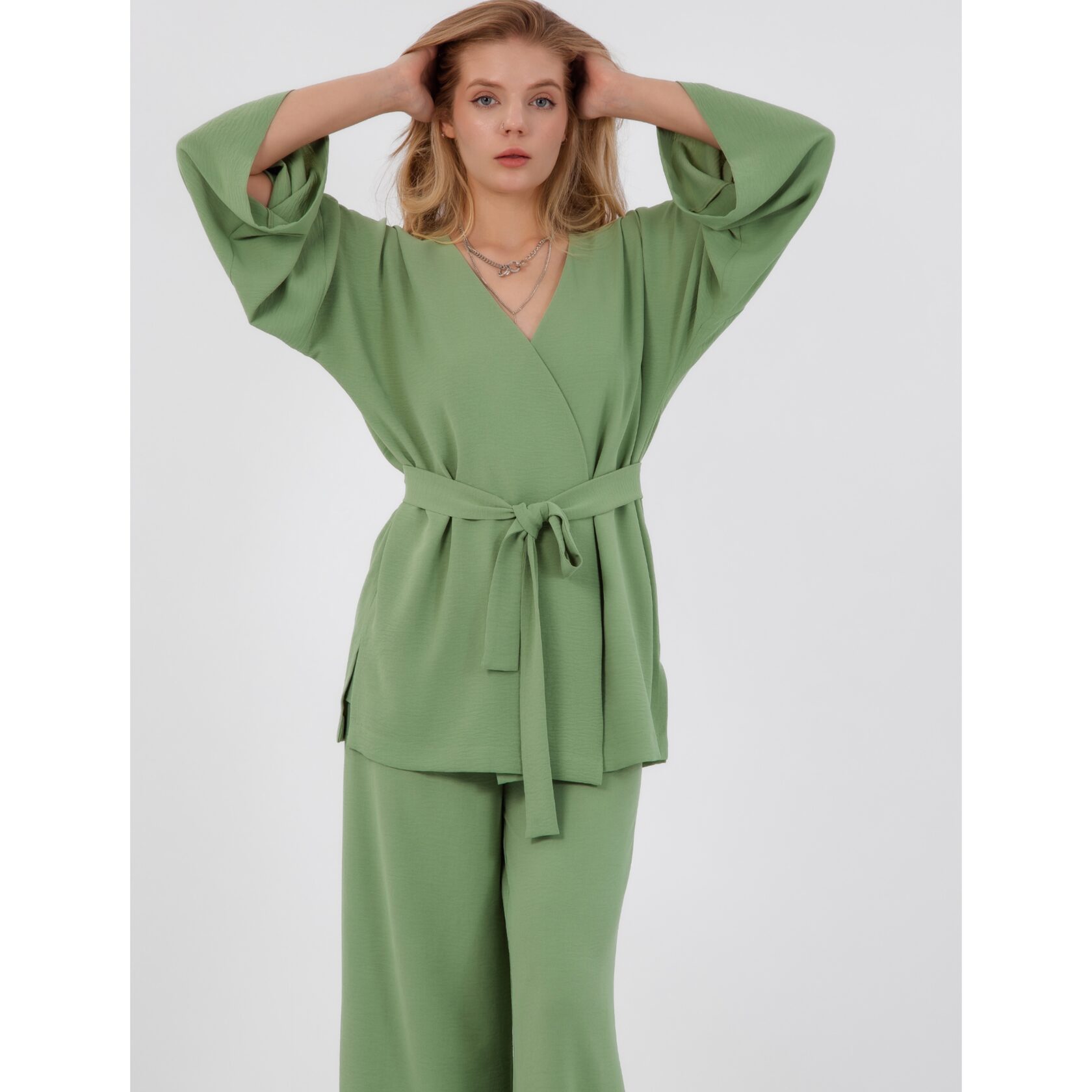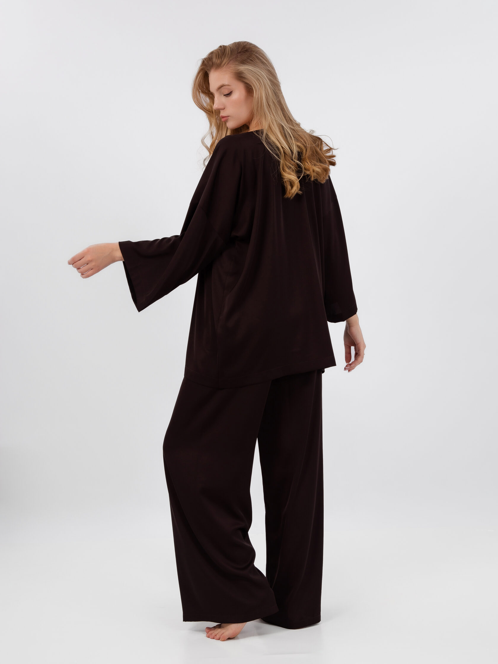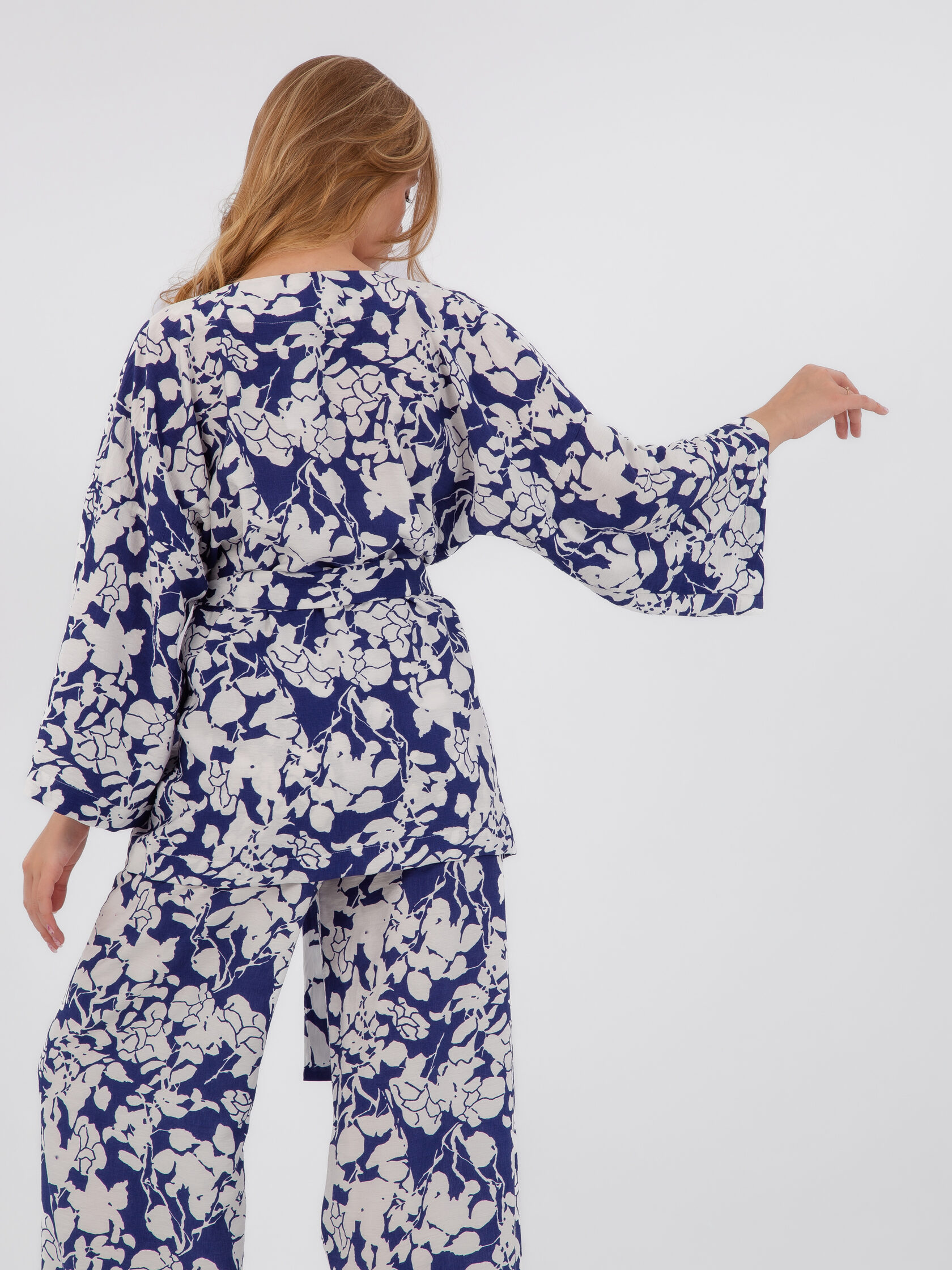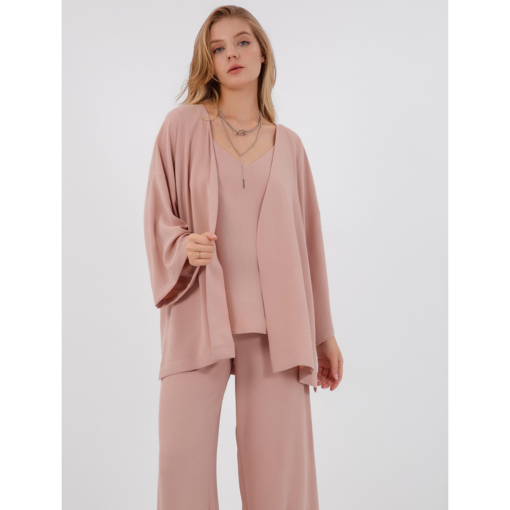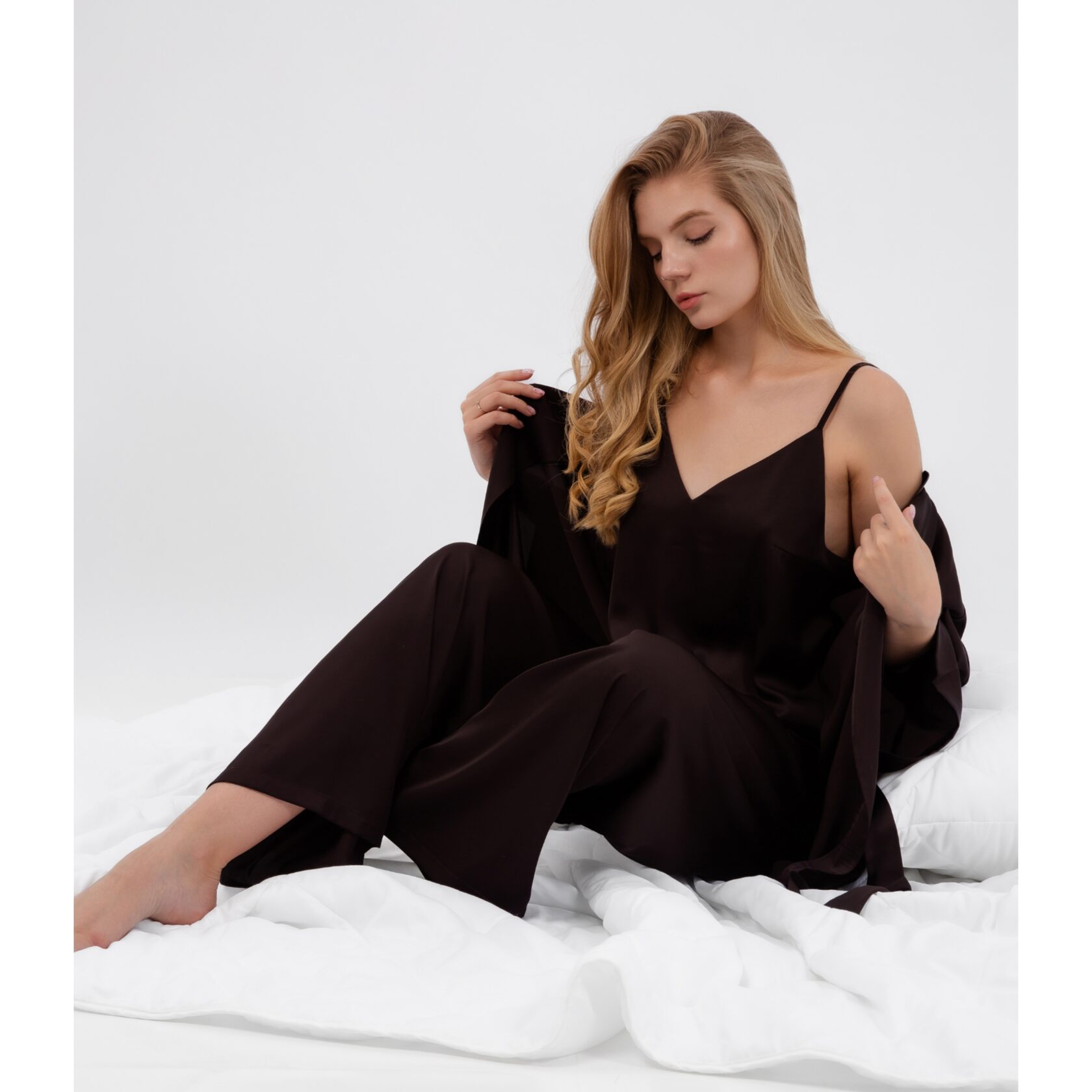 Костюм (топ, брюки, короткое кимоно с поясом) в пижамном стиле