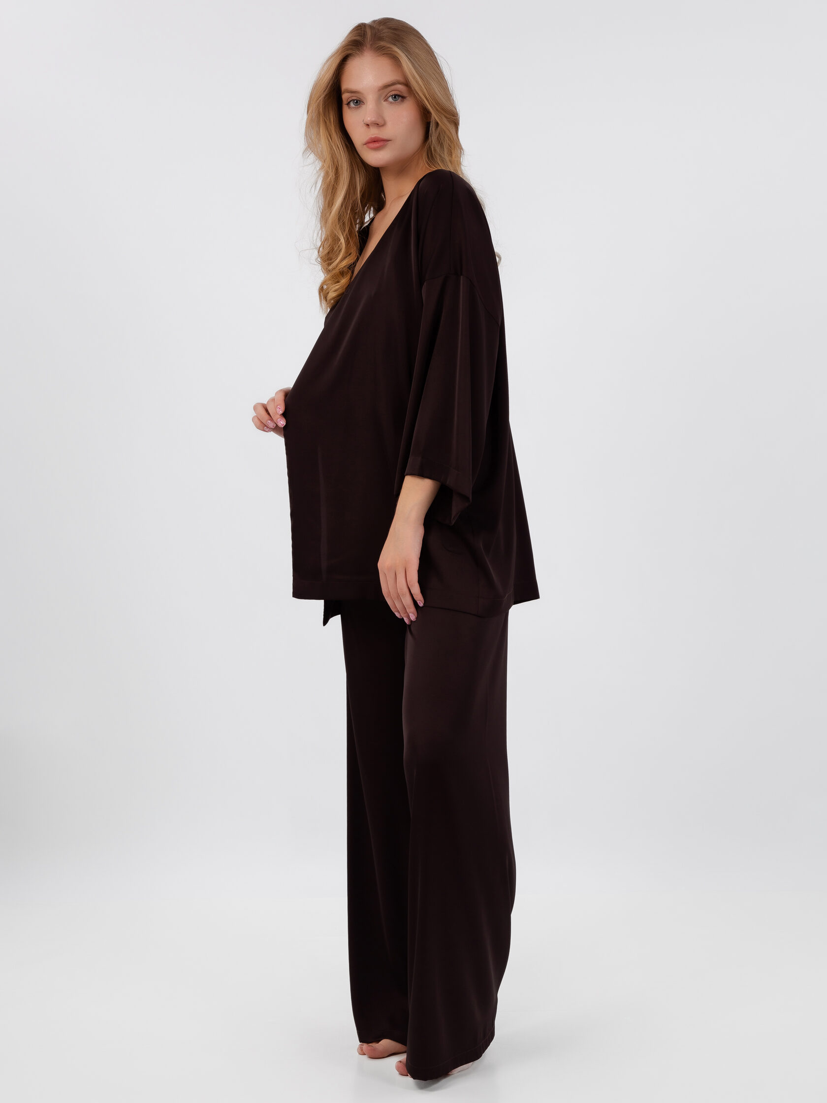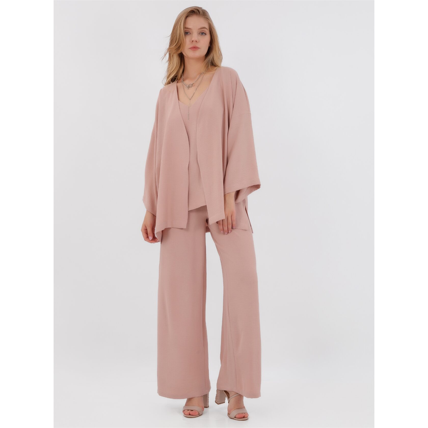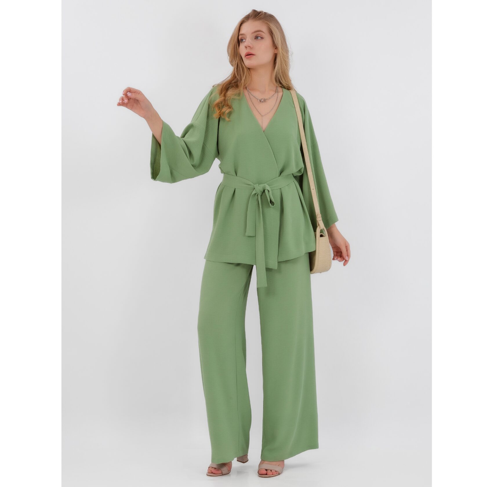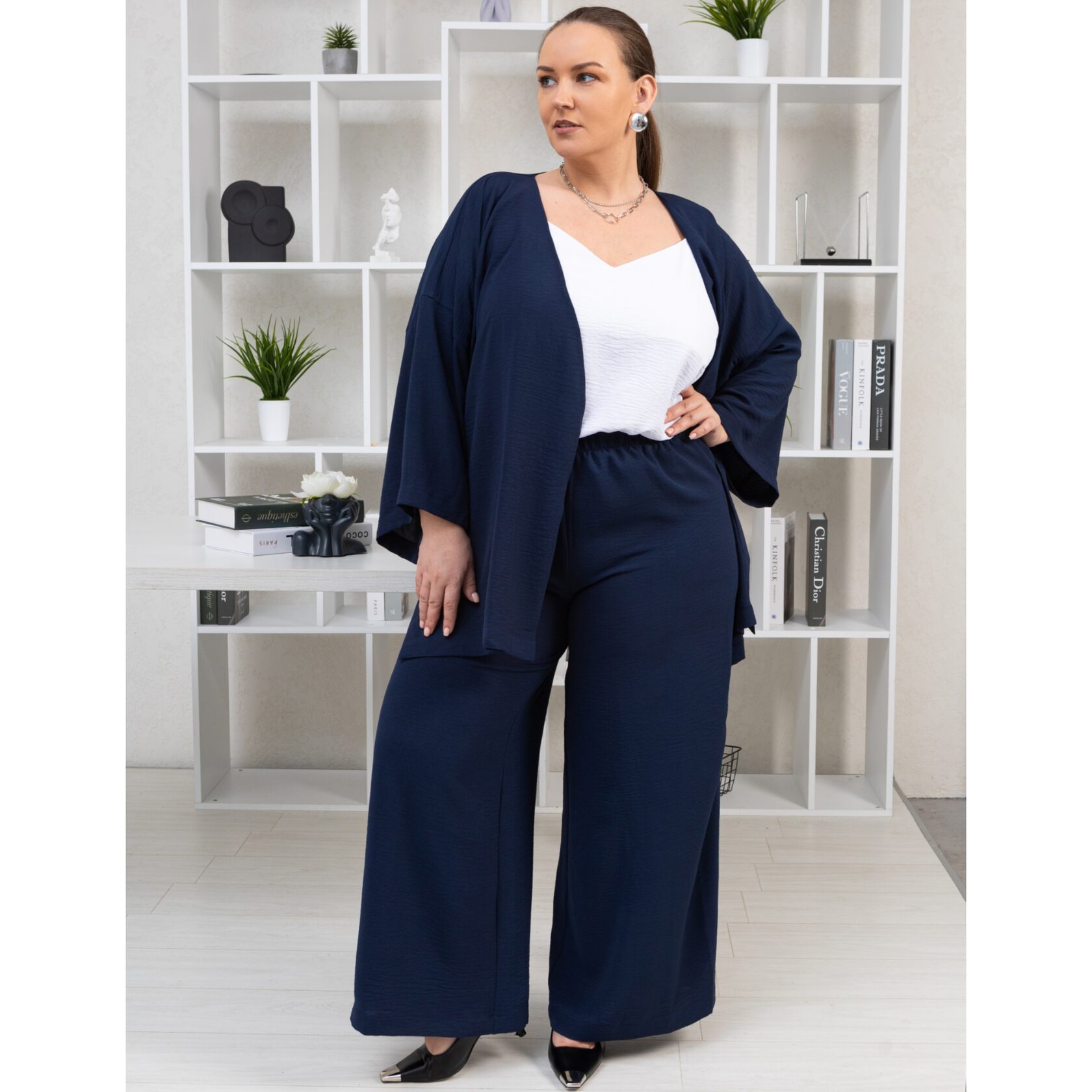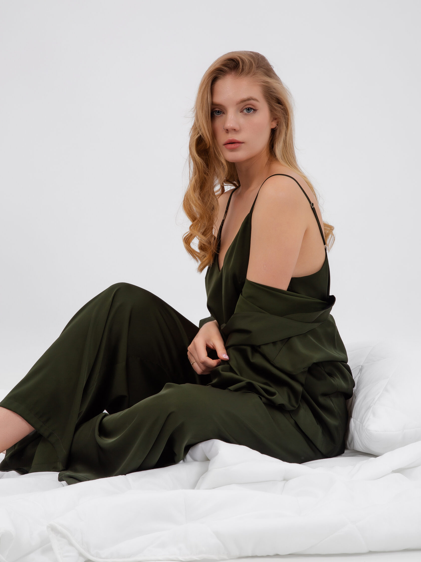 Костюм (топ, брюки, короткое кимоно с поясом) в пижамном стиле
