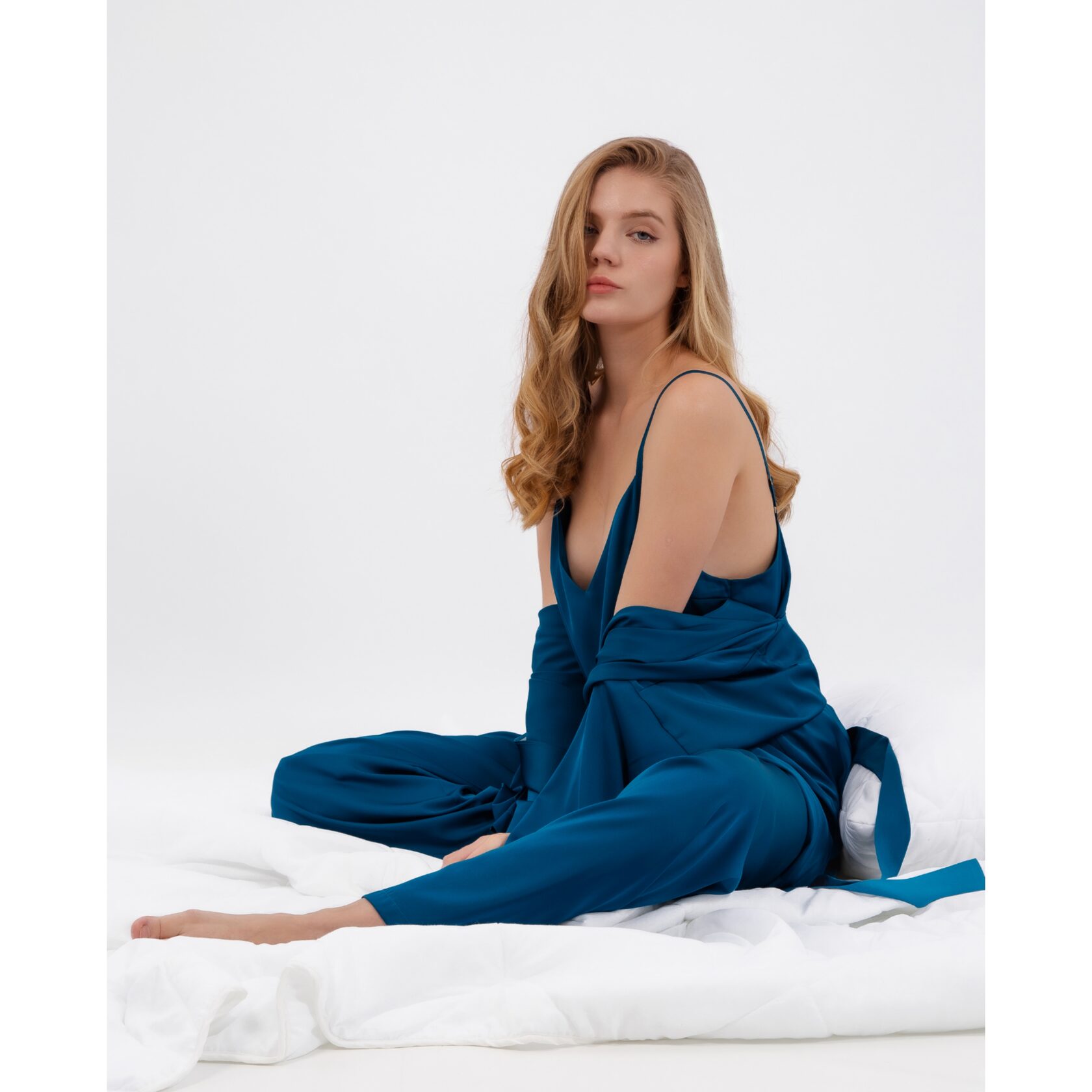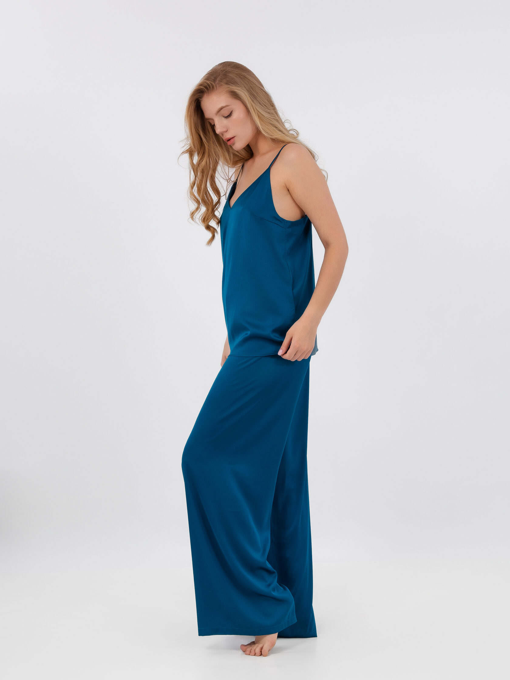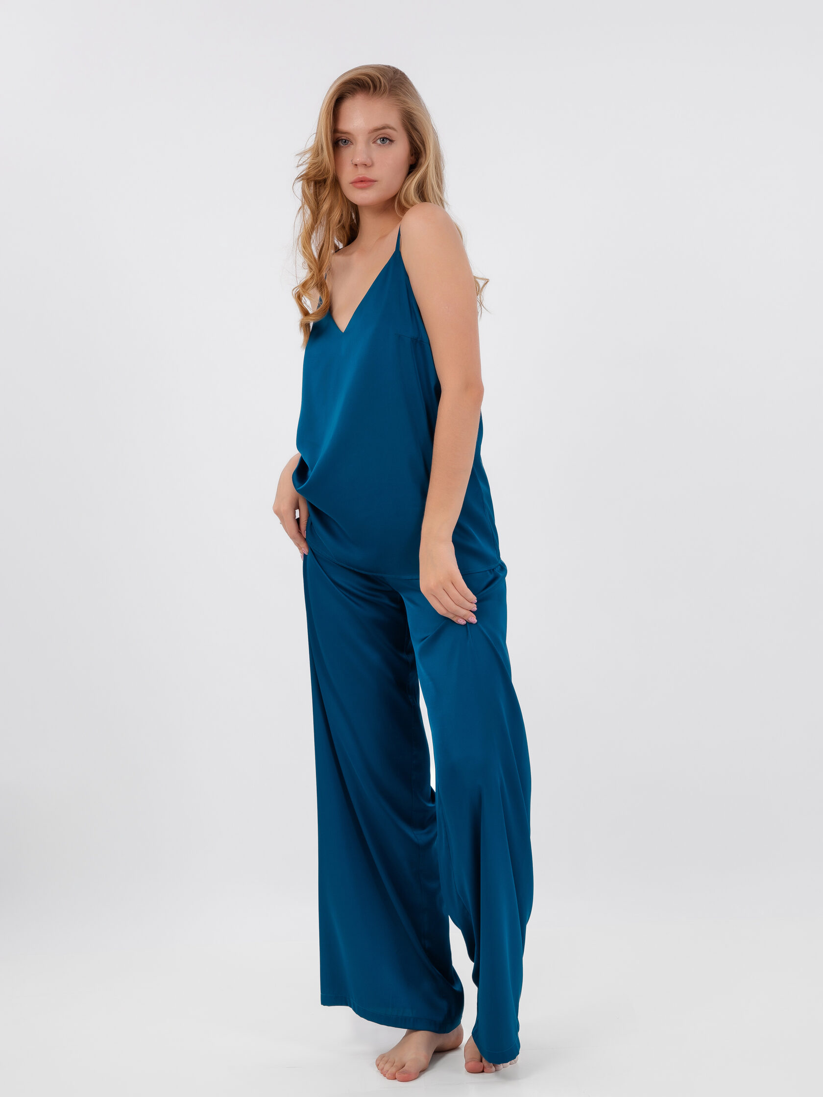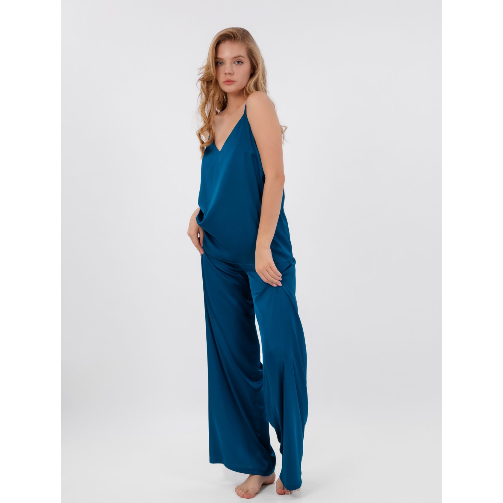 Топ на регулируемых лямках и брюки на регулируемой резинке. Под заказ пижама может быть произведена из любой другой ткани, подходящей по технологии и в любых размерах. Товар поставляется с маркировкой Честный знак. Изделие продается как самостоятельная единица. Возможна поставка данной модели в комплекте с кимоно или рубашкой, как костюм в пижамном стиле или пижама. Цена указана при оптовом заказе от 50 до 1000 единиц. Свыше 1000 ед. стоимость обсуждается индивидуально. Для оценки качества, посадки модели по фигуре можно оформить заказ одной единицы, предварительно заключив договор.
