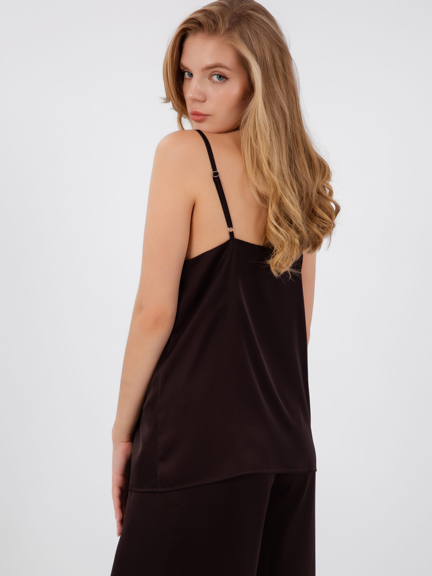 Топ на регулируемых бретелях, фурнитура металлическая, лиф двойной, продублирован дублирином. Идеальное качество пошива. Под заказ может быть произведен из любой другой ткани, подходящей по технологии и в любых размерах. Товар поставляется с маркировкой Честный знак. Изделие продается как самостоятельная единица. Возможна поставка данной модели в комплекте с брюками паллацио, шортами, рубашкой или кимоно, как костюм в пижамном стиле или пижама. Цена указана при оптовом заказе от 50 до 1000 единиц. Свыше 1000 ед. стоимость обсуждается индивидуально. Для оценки качества, посадки модели по фигуре можно оформить заказ одной единицы, предварительно заключив договор.